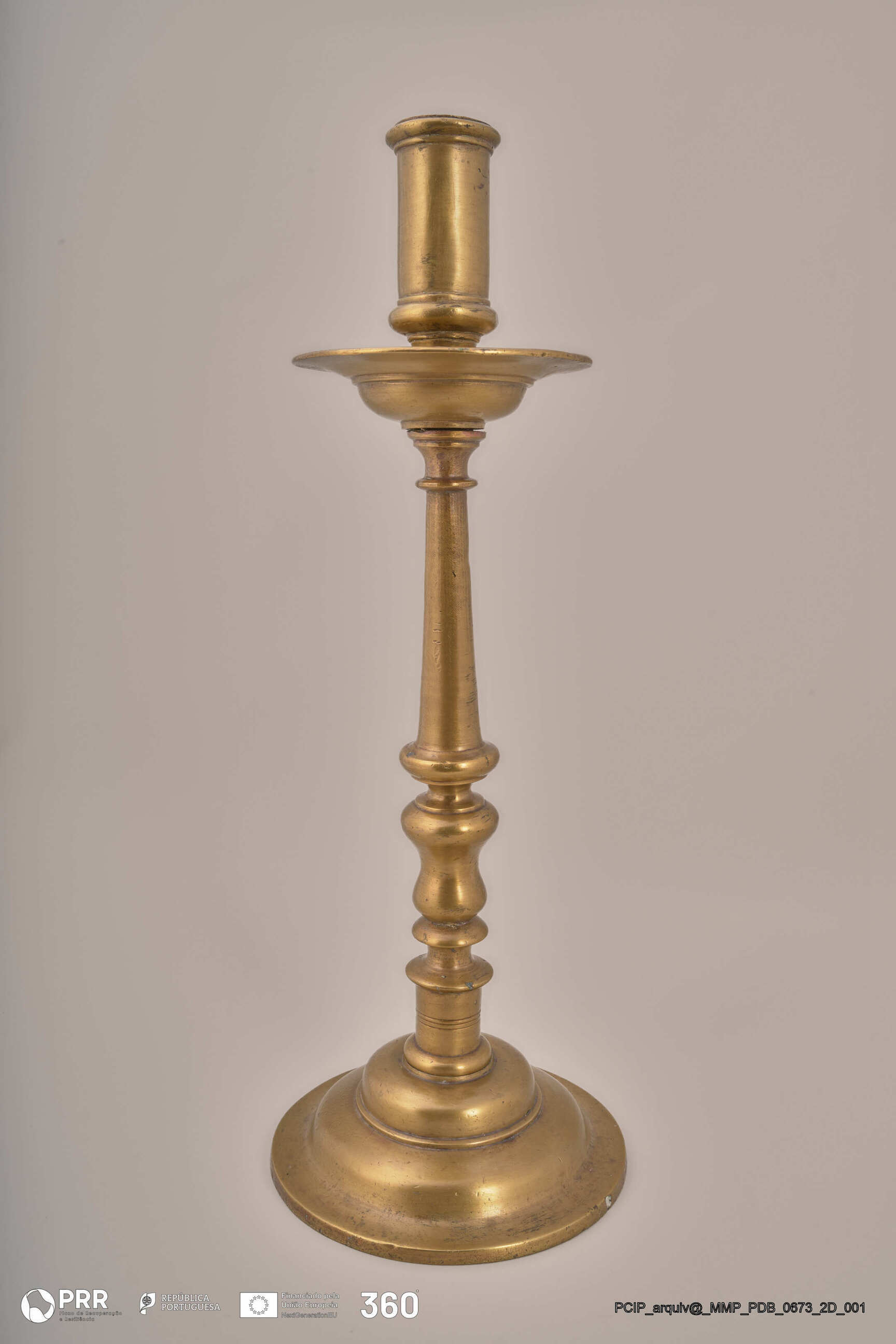 Matéria/Técnica: Desconhecida; Cronologia: Século XVII; Autoria: Desconhecida; Dimensões: Altura: 44,5; Diâmetro: Vela - 3,1 Base - 16,3.