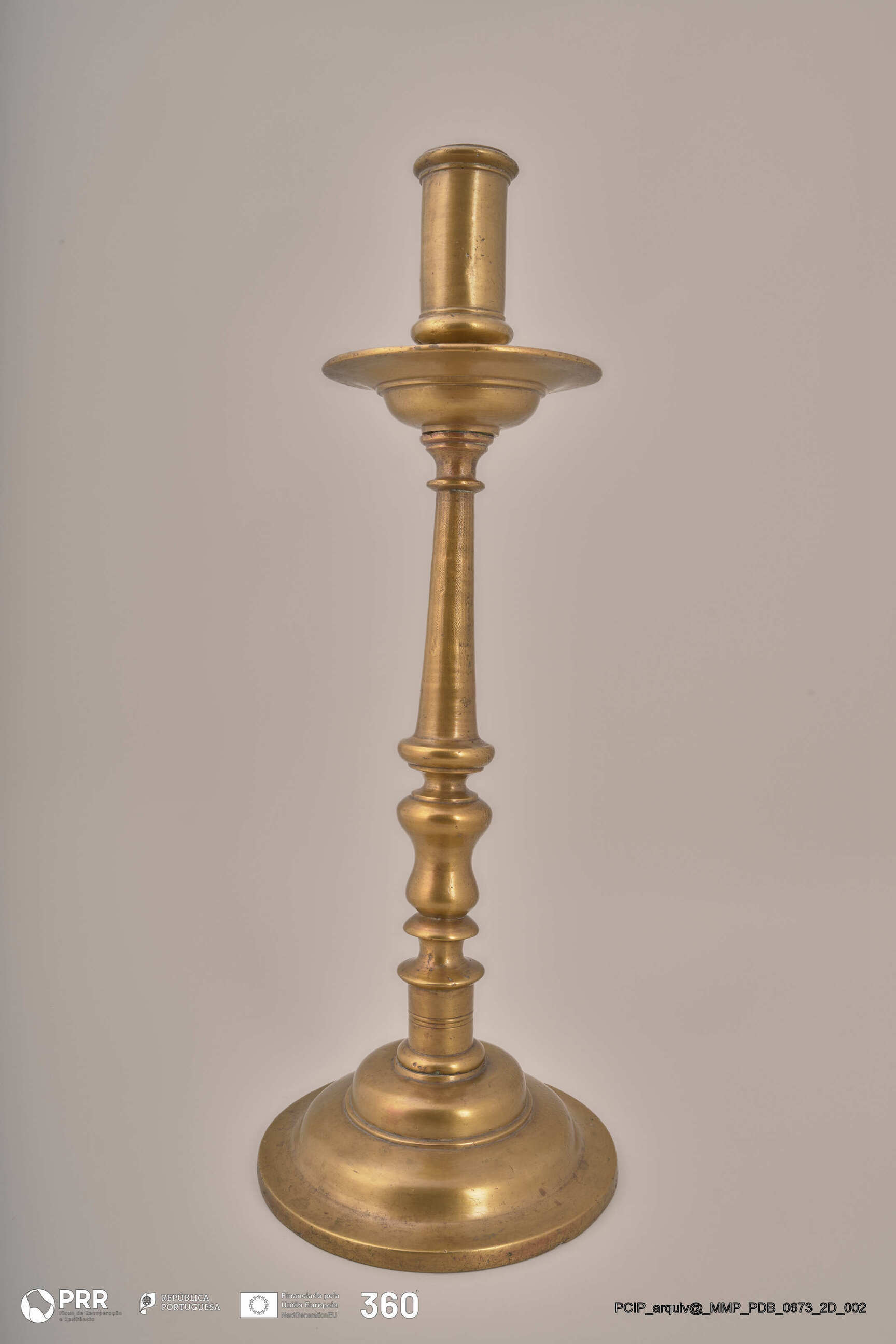 Matéria/Técnica: Desconhecida; Cronologia: Século XVII; Autoria: Desconhecida; Dimensões (cm): Altura: 44,5; Diâmetro: Vela - 3,1 Base - 16,3.