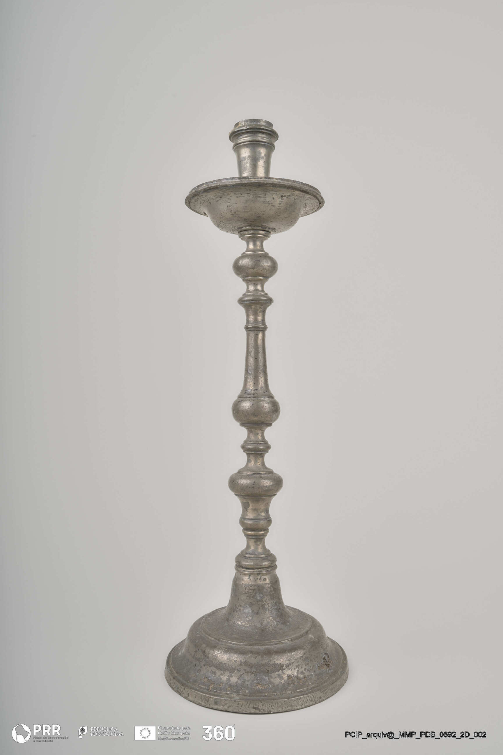 Matéria/Técnica: Desconhecida; Cronologia: Século XVII; Autoria: Desconhecida; Dimensões (cm): Altura: 41,5; Diâmetro: Base - 13,7 Vela - 2,4.