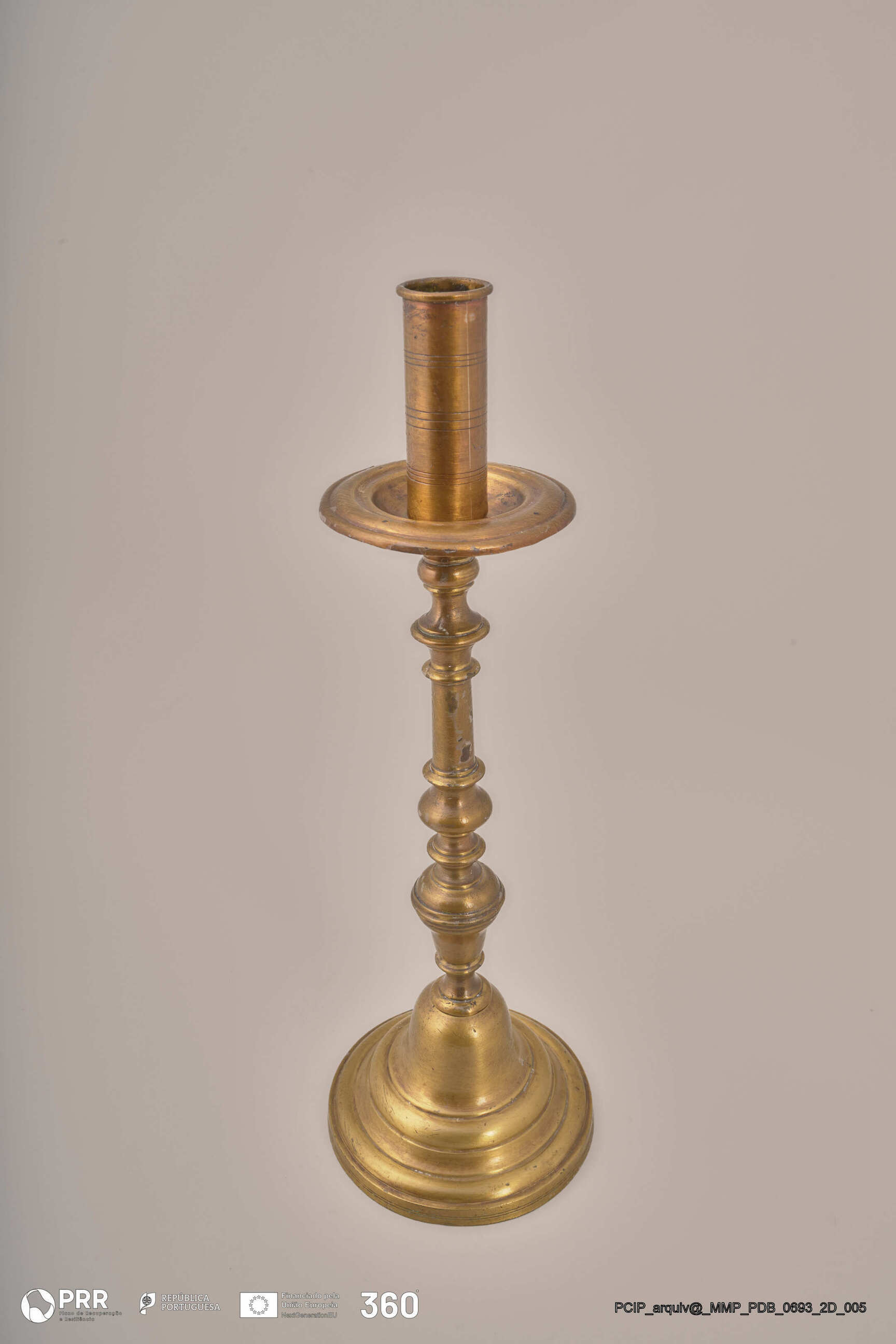 Matéria/Técnica: Desconhecida; Cronologia: Século XVIII; Autoria: Desconhecida; Dimensões (cm): Altura: 36; Diâmetro: Base - 12 Vela - 2,2.