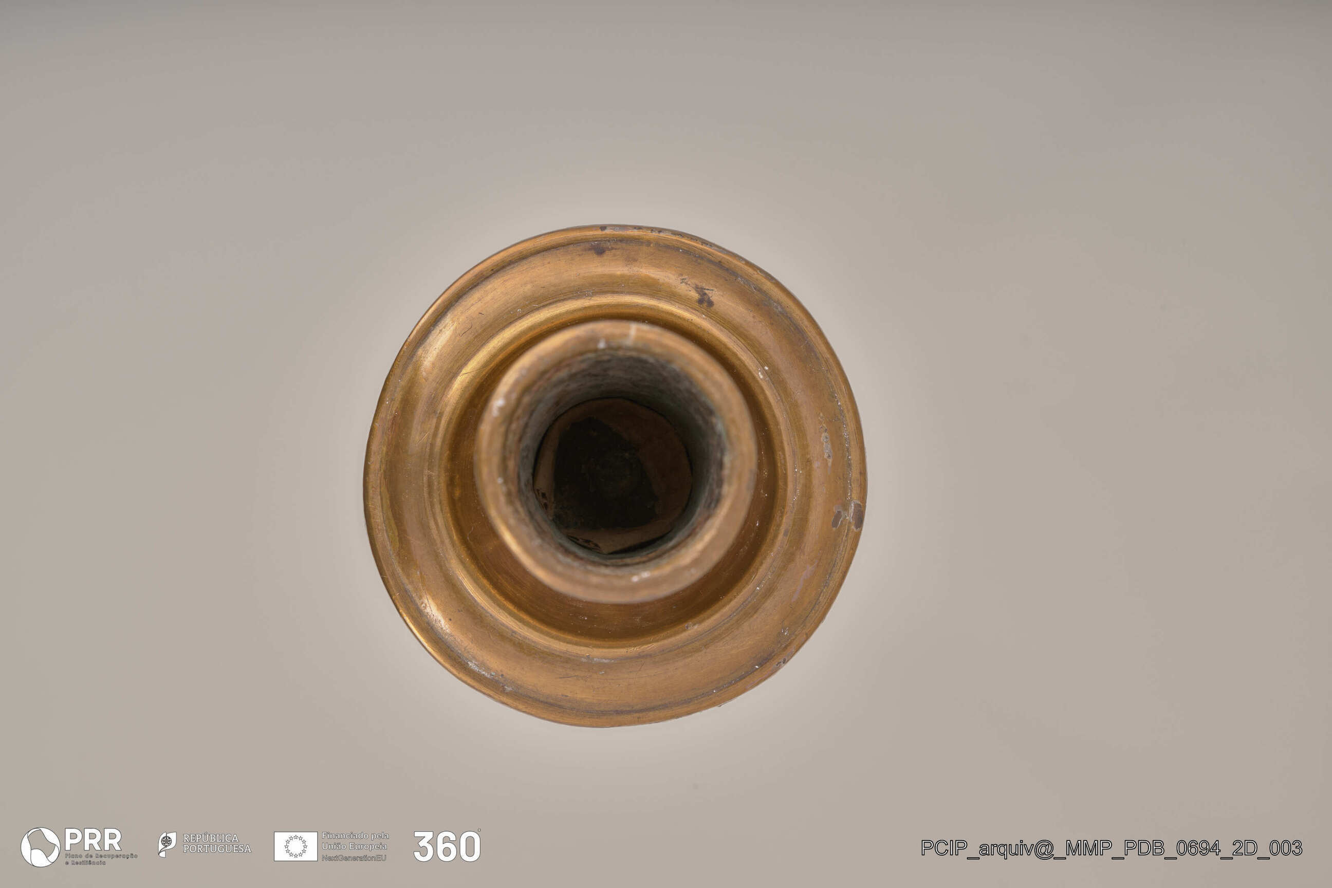Matéria/Técnica: Desconhecida; Cronologia: Século XVIII; Autoria: Desconhecida; Dimensões (cm): Altura: 36; Diâmetro: Base - 12 Vela - 2,2.
