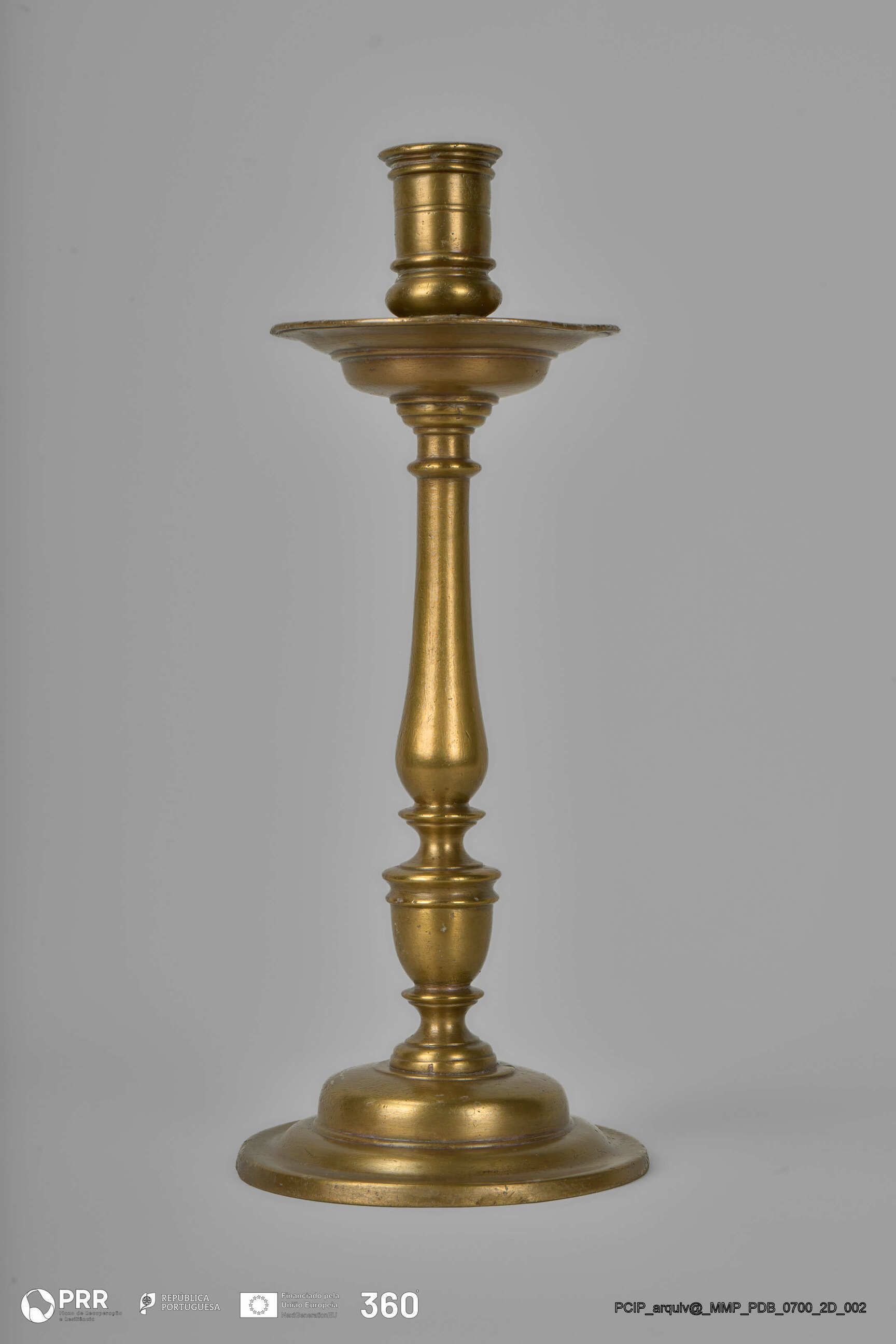 Matéria/Técnica: Desconhecida; Cronologia: Século XVII; Autoria: Desconhecida; Dimensões (cm): Altura: 32,5; Diâmetro: Base - 13,5 Vela - 2,5.