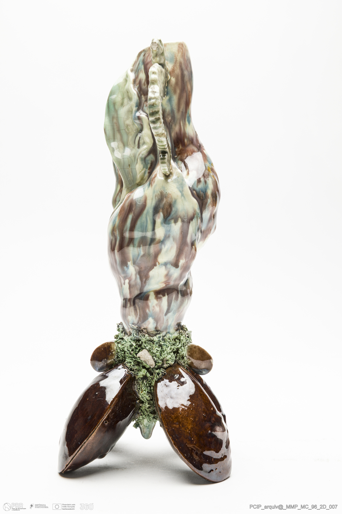 Matéria/Técnica: Barro vermelho moldado e modelado. Vidrado polícromo com escorridos preto, castanho escuro e mel, verde e camurça; Cronologia: 1901; Autoria: Rafael Bordalo Pinheiro, Fábrica de Faianças das Caldas da Rainha; Dimensões (cm): Desconhecidas.