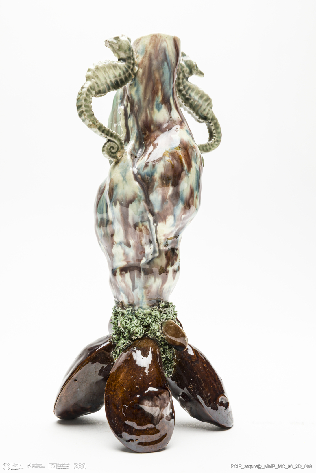 Matéria/Técnica: Barro vermelho moldado e modelado. Vidrado polícromo com escorridos preto, castanho escuro e mel, verde e camurça; Cronologia: 1901; Autoria: Rafael Bordalo Pinheiro, Fábrica de Faianças das Caldas da Rainha; Dimensões (cm): Desconhecidas.