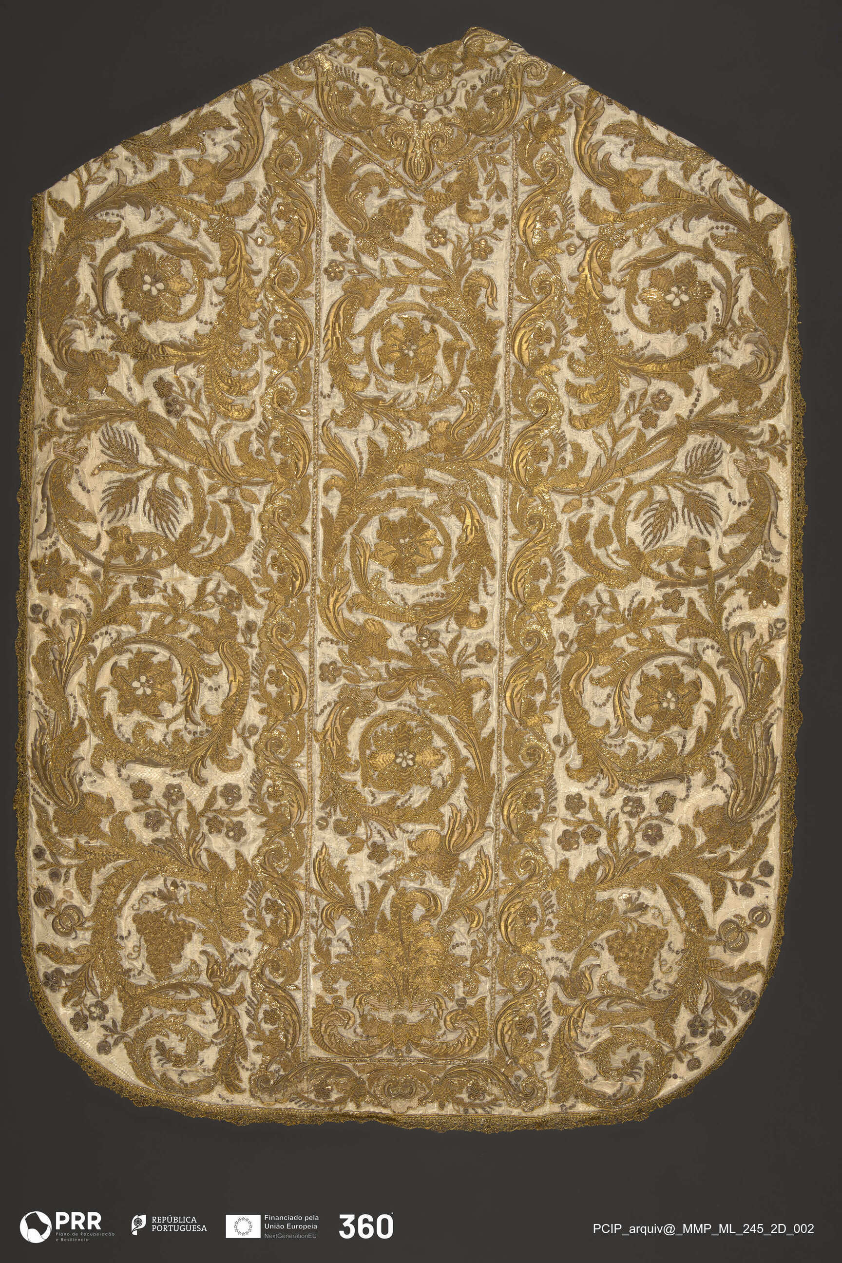 Matéria/Técnica: Bordado: fio de ouro de várias texturas, estendido, canutilho, lâmina batida e em cordão Aplicação de lantejoulas e galão rendado; Cronologia: Séculos XVIII - XIX; Autoria: Desconhecida; Dimensões (cm): Altura: 102 x Largura: 76.