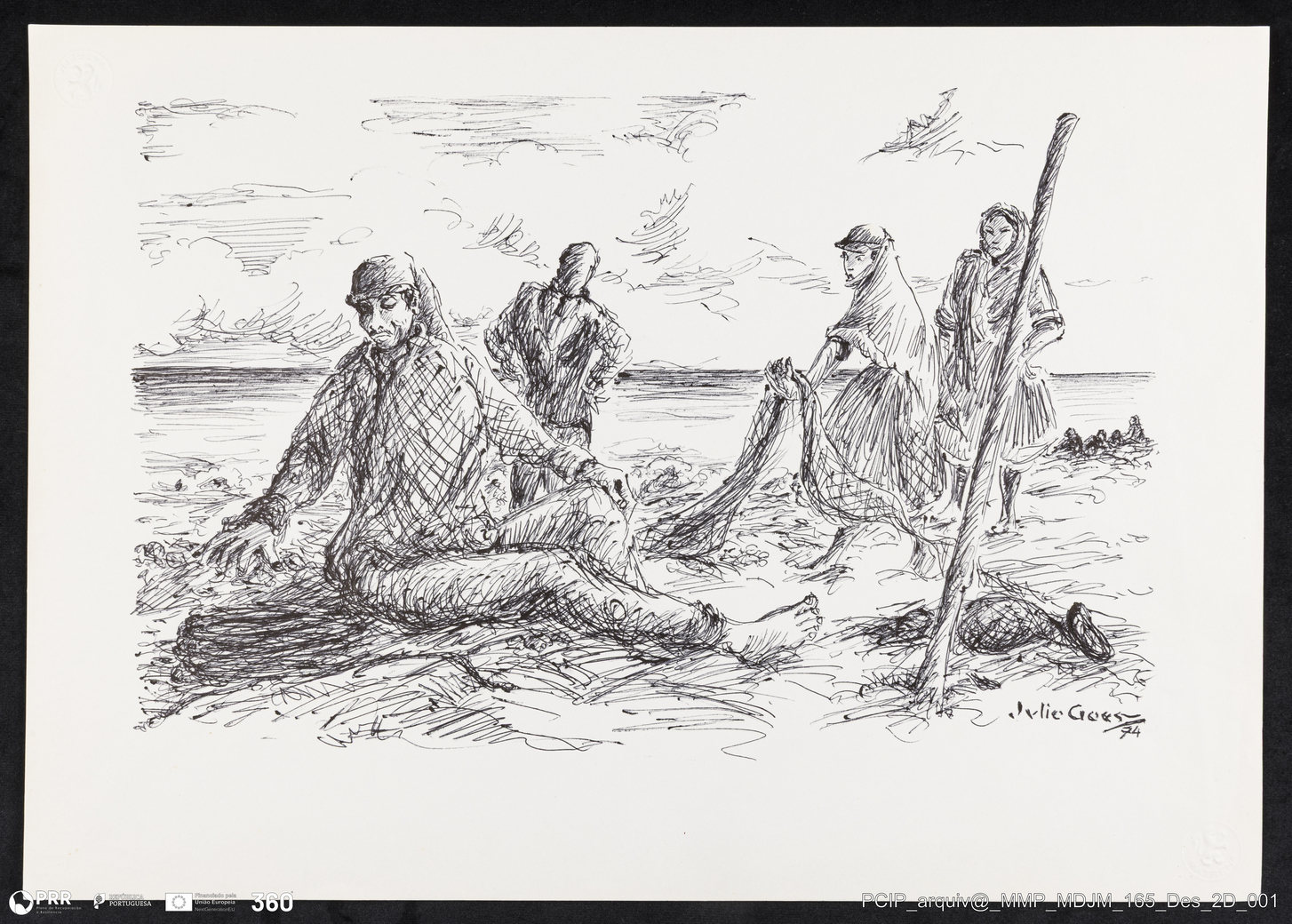 Matéria/Técnica: Desenho a esferográfica sobre papel; Cronologia: 1974; Autoria: Júlio Goes; Dimensões: Altura: 43 cm x Largura: 30,4 cm.