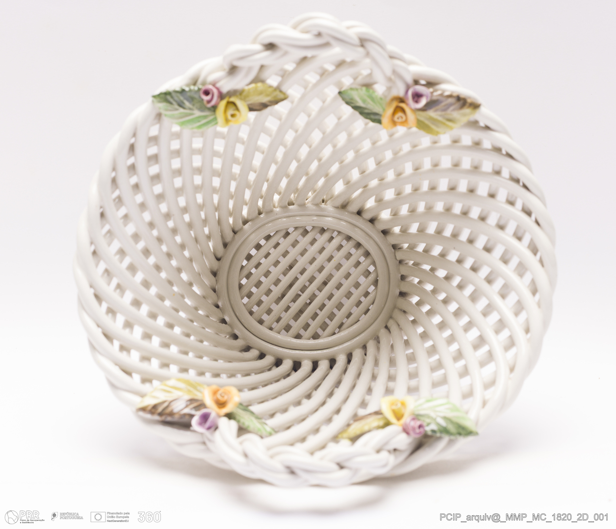 Matéria/Técnica: Pasta de faiança branca. A técnica da verguinha consiste no entrelaçar, sobre uma forma escolhida, tiras de pasta obtidas através de uma máquina adaptada para o efeito, dita o engenho. Vidrado transparente amarelo, verde e rosa; Cronologia: 1986; Autoria: Maria Julia Arroja / Fábrica de Faianças Subtil, Caldas da Rainha, Portugal; Dimensões (cm): Altura: 15; Diâmetro: 18.