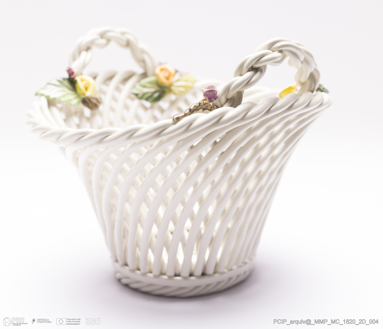 Matéria/Técnica: Pasta de faiança branca. A técnica da verguinha consiste no entrelaçar, sobre uma forma escolhida, tiras de pasta obtidas através de uma máquina adaptada para o efeito, dita o engenho. Vidrado transparente amarelo, verde e rosa; Cronologia: 1986; Autoria: Maria Julia Arroja / Fábrica de Faianças Subtil, Caldas da Rainha, Portugal; Dimensões (cm): Altura: 15; Diâmetro: 18.