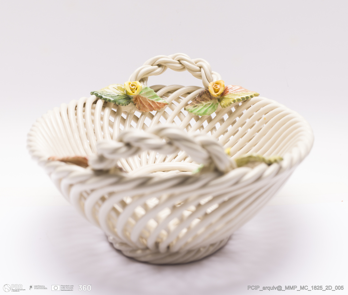 Matéria/Técnica: Barro branco. A técnica da verguinha consiste no entrelaçar, sobre uma forma escolhida, tiras de pasta obtidas através de uma máquina adaptada para o efeito, dita o engenho. Vidrado transparente amarelo, verde e rosa; Cronologia: século XX; Autoria: Maria Julia Arroja / Fábrica de Faianças Subtil, Caldas da Rainha, Portugal; Dimensões (cm): Altura: 9,6; Largura: 28; Comprimento: 18.