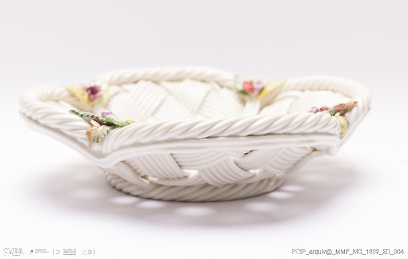 Matéria/Técnica: Pasta de faianças. Técnica da verguinha, que consiste no entrelaçar, sobre uma forma escolhiada, tiras de pasta obtidas através de uma máquina adaptada para o efeito, dita o engenho. Vidrado polícromo: camurça, verde vermelho e; Cronologia: 1980; Autoria: Maria Julia Arroja / Fábrica de Faianças Subtil, Caldas da Rainha, Portugal; Dimensões (cm): Altura: 6; Diâmetro:23.