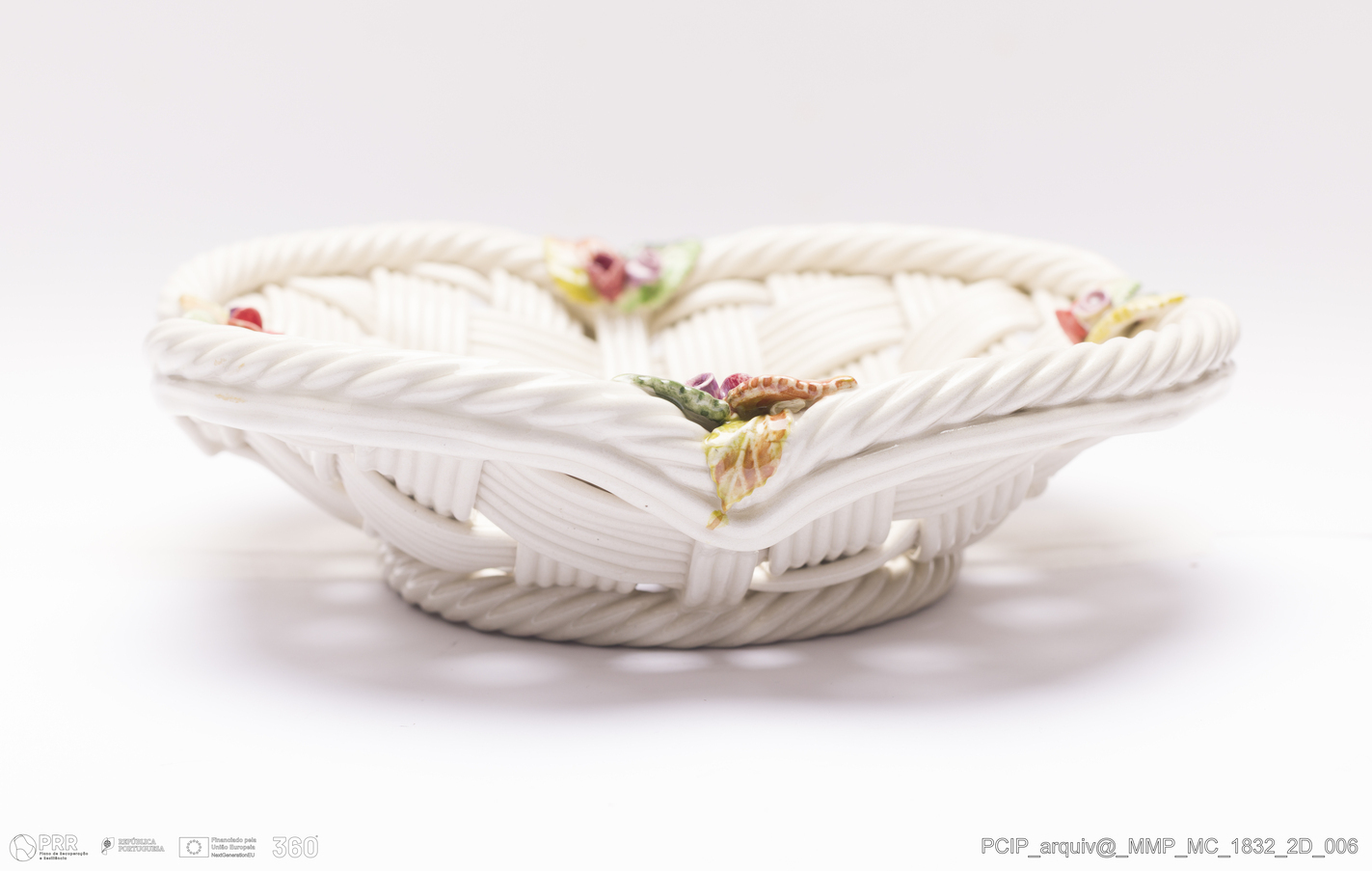 Matéria/Técnica: Pasta de faianças. Técnica da verguinha, que consiste no entrelaçar, sobre uma forma escolhiada, tiras de pasta obtidas através de uma máquina adaptada para o efeito, dita o engenho. Vidrado polícromo: camurça, verde vermelho e; Cronologia: 1980; Autoria: Maria Julia Arroja / Fábrica de Faianças Subtil, Caldas da Rainha, Portugal; Dimensões (cm): Altura: 6; Diâmetro:23.