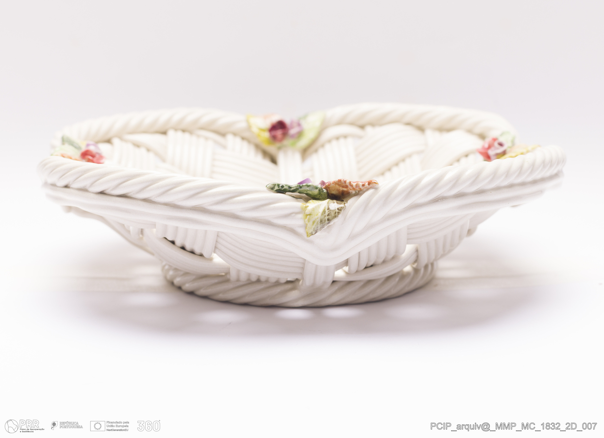 Matéria/Técnica: Pasta de faianças. Técnica da verguinha, que consiste no entrelaçar, sobre uma forma escolhiada, tiras de pasta obtidas através de uma máquina adaptada para o efeito, dita o engenho. Vidrado polícromo: camurça, verde vermelho e; Cronologia: 1980; Autoria: Maria Julia Arroja / Fábrica de Faianças Subtil, Caldas da Rainha, Portugal; Dimensões (cm): Altura: 6; Diâmetro:23.
