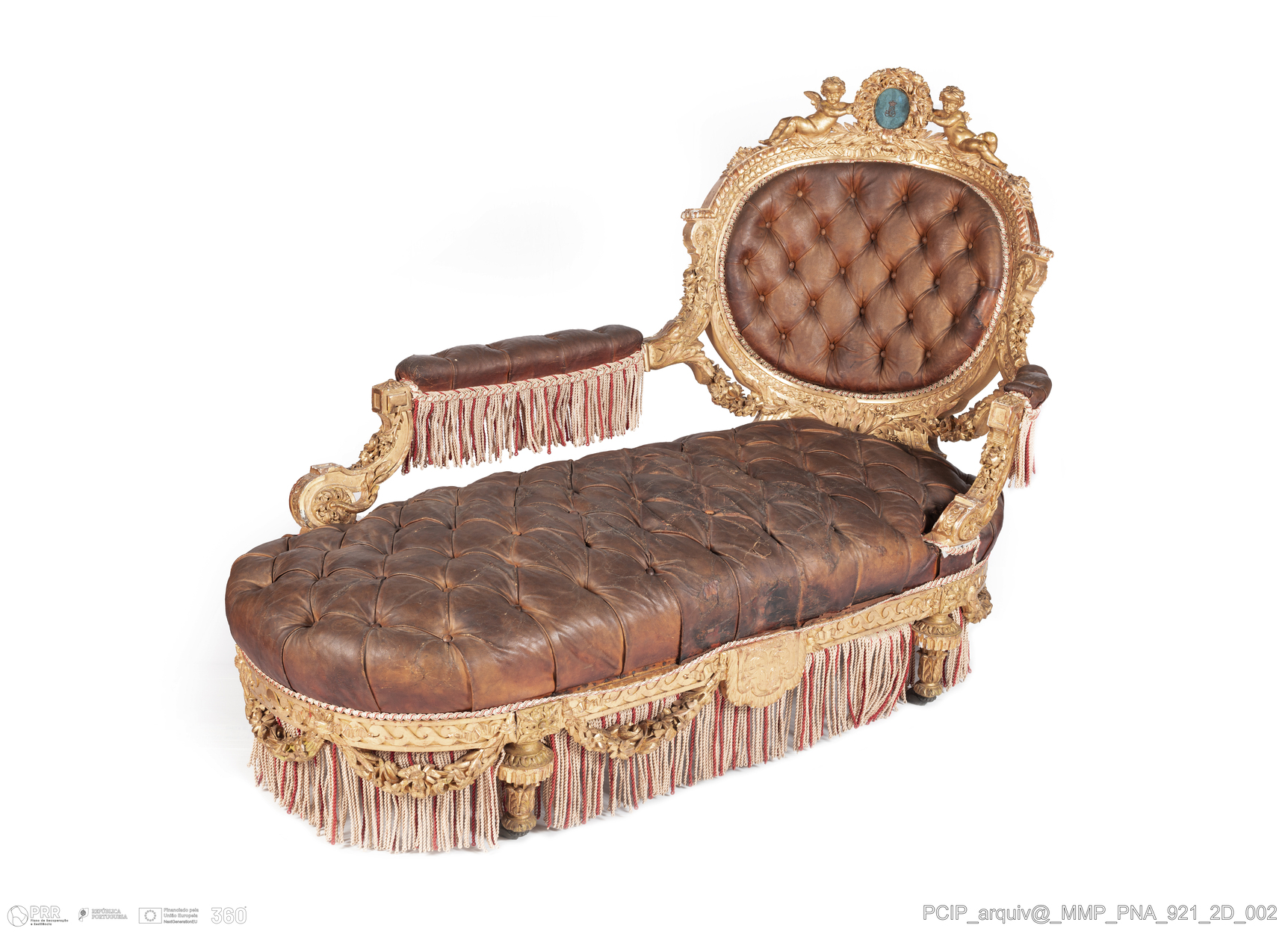 Matéria/Técnica: Madeira de faia (?); preparação branca; bolús vermelho; folha metálica de ouro de lei; metal; cabedal; 2777620 seda); crina e pedra; Cronologia: 1852 - 1870; Autoria: Desconhecida; Dimensões (cm): Altura: 116,0; Largura: 168,0; Profundidade: 80,0.