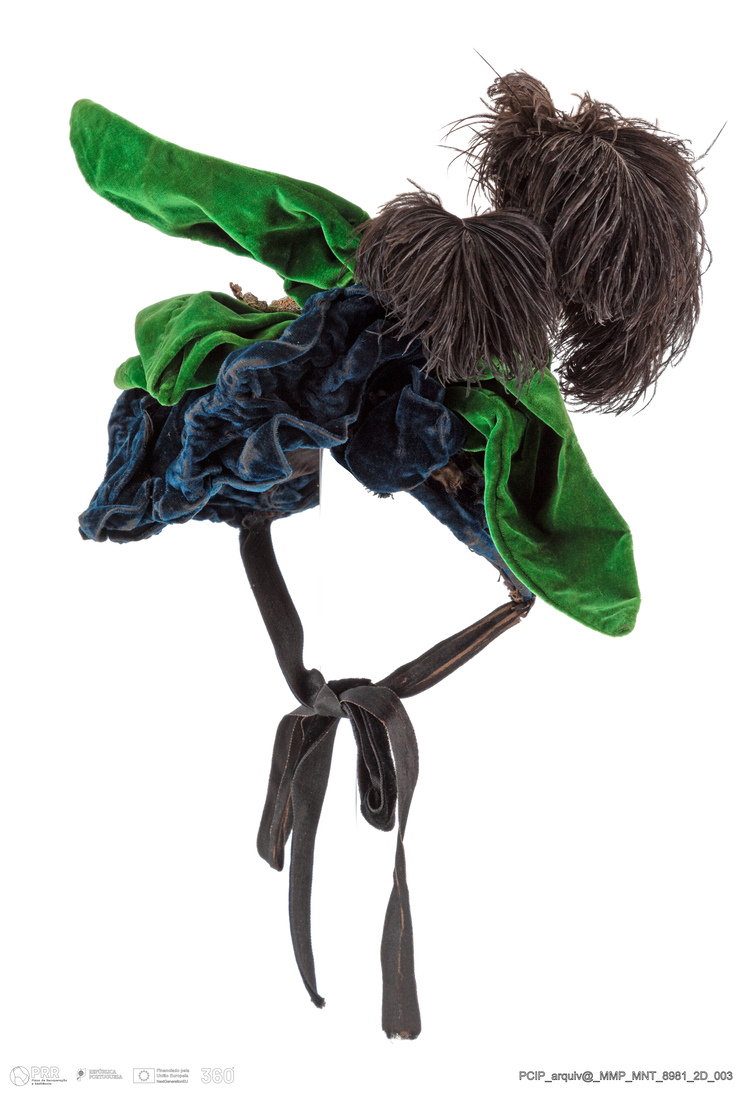 Matéria/Técnica: Seda verde; seda preta; pena de avestruz preta; fio laminado prateado; fio laminado dourado; lantejoulas.; Cronologia: 1880 - 1890; Autoria: Desconhecida; Dimensões (cm): Altura: 12 cm; Diâmetro: 14 cm.
