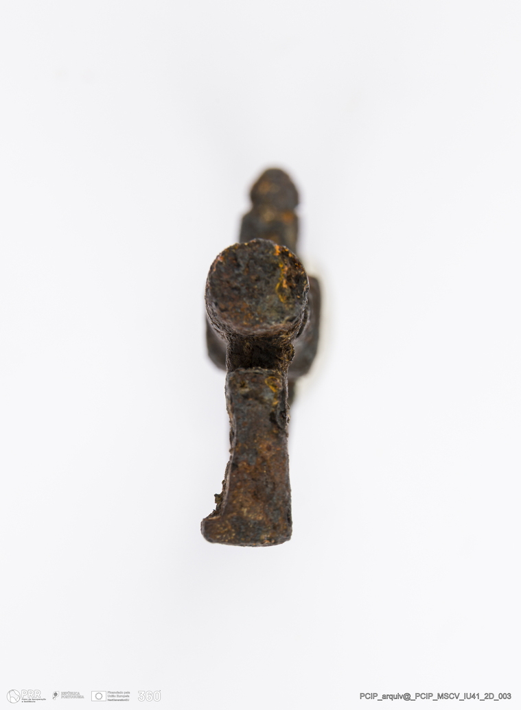 Matéria/Técnica: Ferro; Cronologia: Século XVII; Autoria: Desconhecida; Dimensões: Altura: 63,5mm; Diâmetro haste: 30mm; Largura: 33mm; Espessura: 9mm.