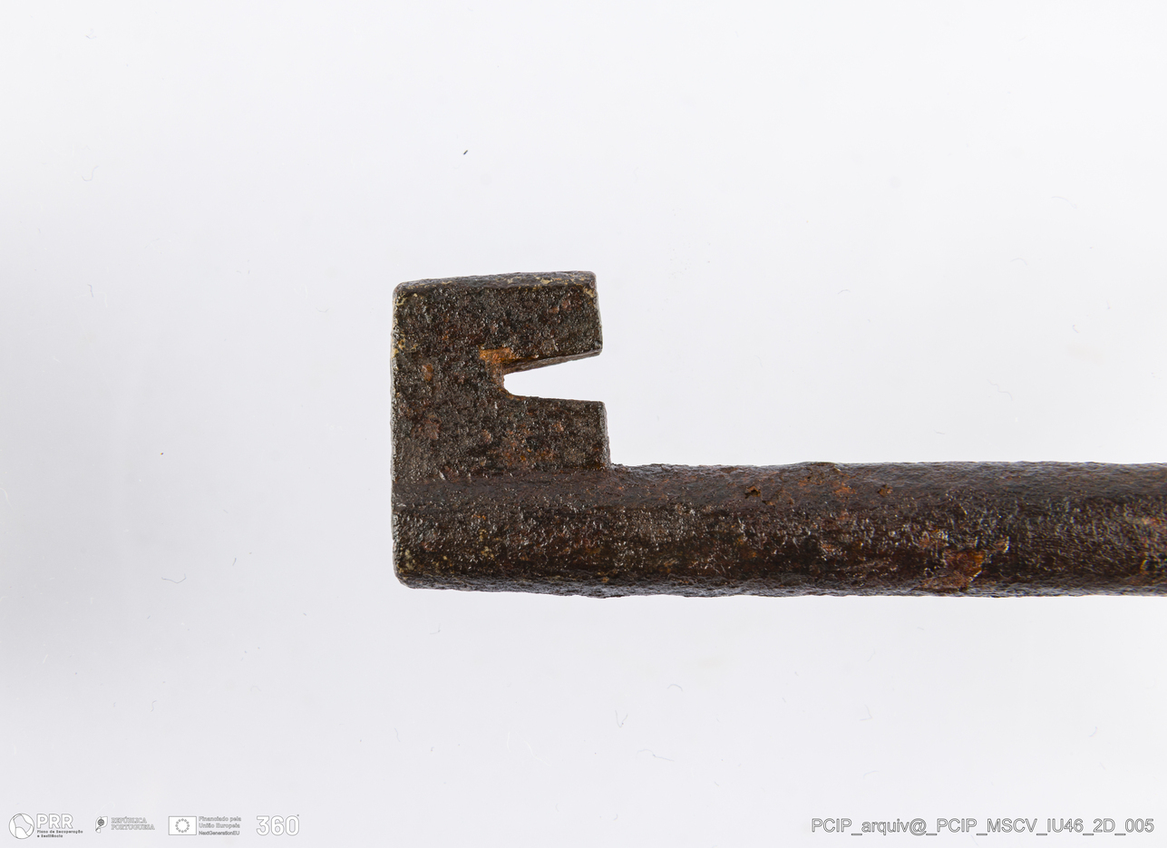 Matéria/Técnica: Ferro; Cronologia: Século XVII; Autoria: Desconhecida; Dimensões: Altura: 78mm; Largura: 37mm; Espessura: 8mm; Diâmetro haste: 37mm.