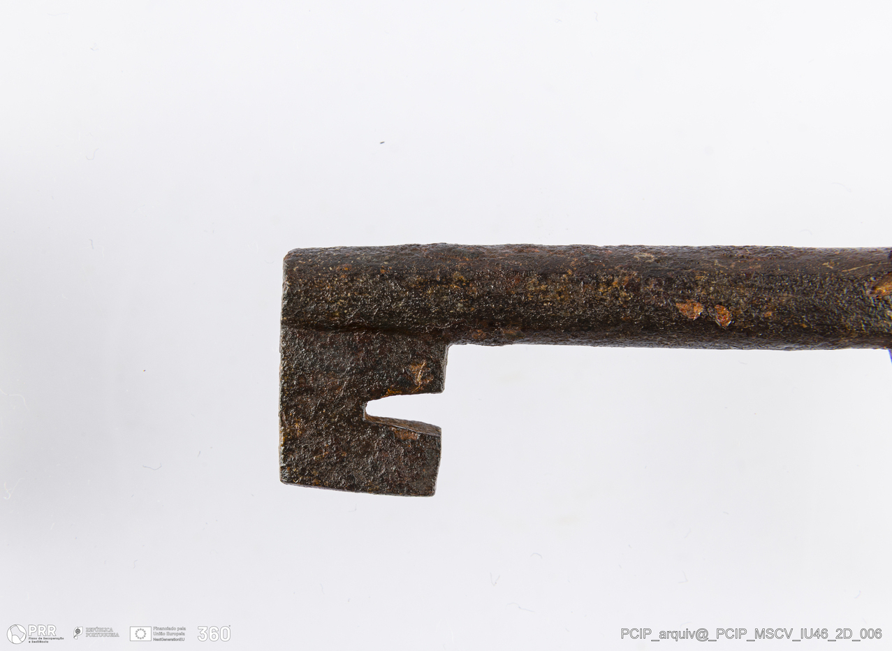 Matéria/Técnica: Ferro; Cronologia: Século XVII; Autoria: Desconhecida; Dimensões: Altura: 78mm; Largura: 37mm; Espessura: 8mm; Diâmetro haste: 37mm.