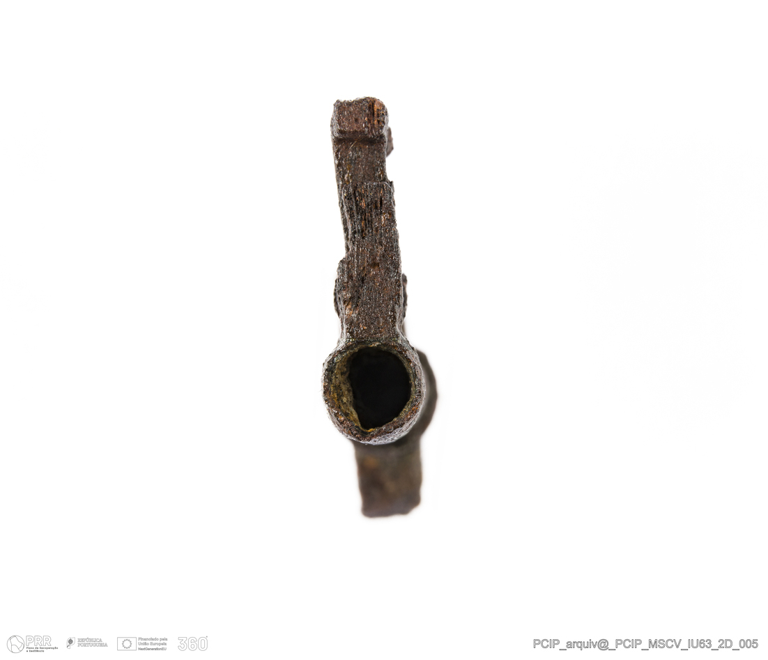 Matéria/Técnica: Ferro; Cronologia: Século XVII; Autoria: Desconhecida; Dimensões: Altura: 8mm; Largura: 35mm; Espessura: 12mm; Diâmetro haste: 28,5mm.