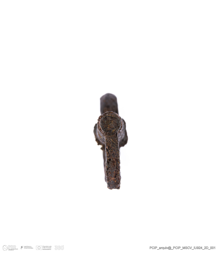Matéria/Técnica: Ferro; Cronologia: Século XVII; Autoria: Desconhecida; Dimensões: Altura: 41,5mm; Largura: 23mm; Espessura: 7,5mm; Diâmetro haste: 21,5mm.