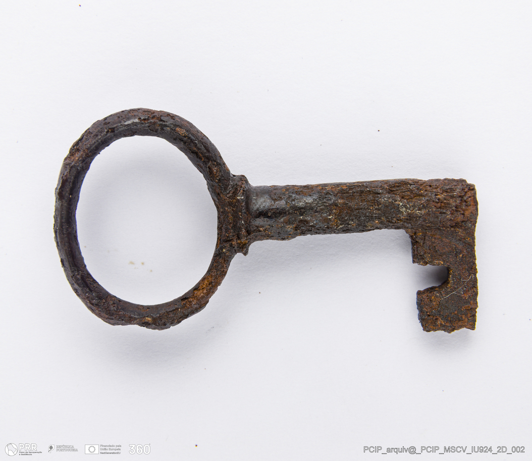 Matéria/Técnica: Ferro; Cronologia: Século XVII; Autoria: Desconhecida; Dimensões: Altura: 41,5mm; Largura: 23mm; Espessura: 7,5mm; Diâmetro haste: 21,5mm.