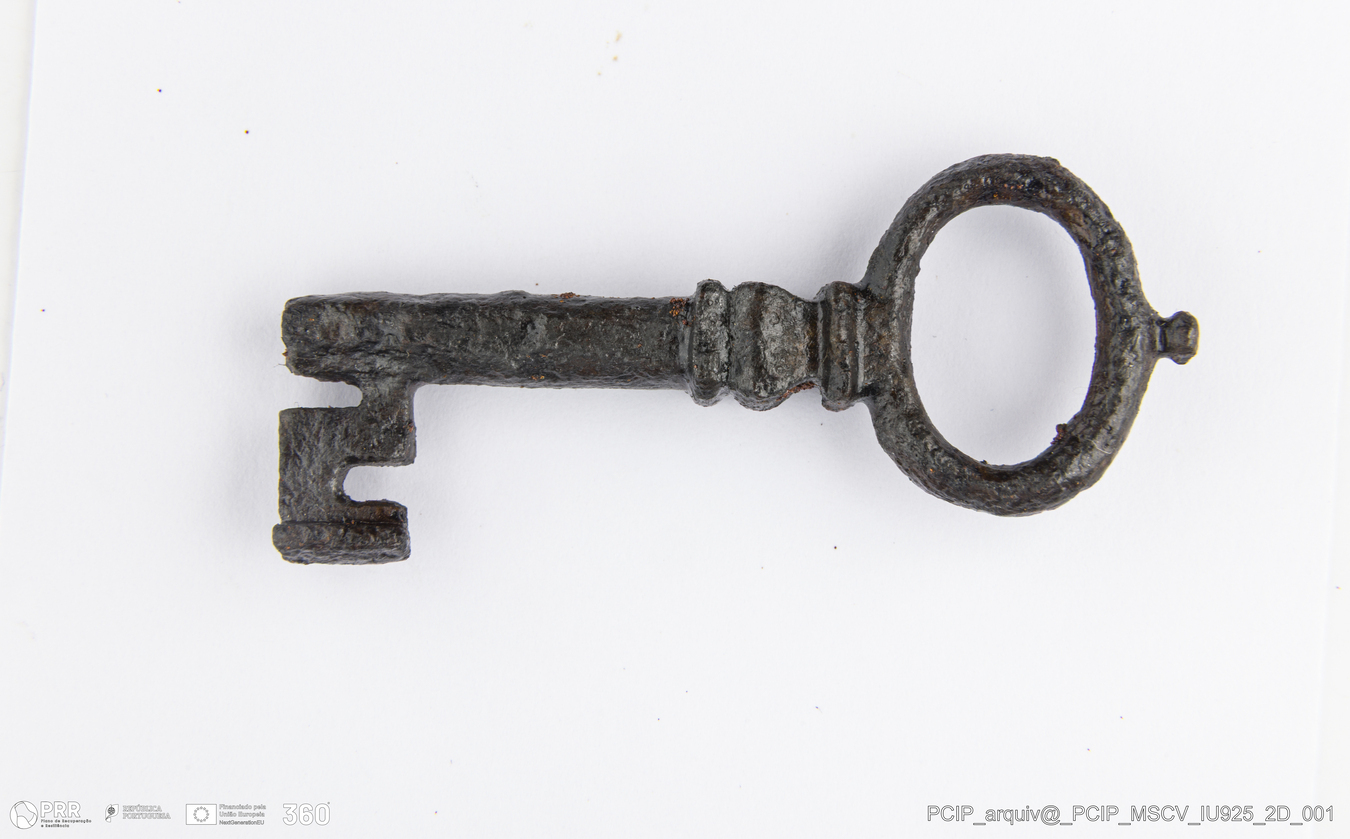 Matéria/Técnica: Ferro; Cronologia: Século XVII; Autoria: Desconhecida; Dimensões: Altura: 45,5mm; Largura: 21,5mm; Espessura: 6,5mm; Diâmetro haste: 18mm.