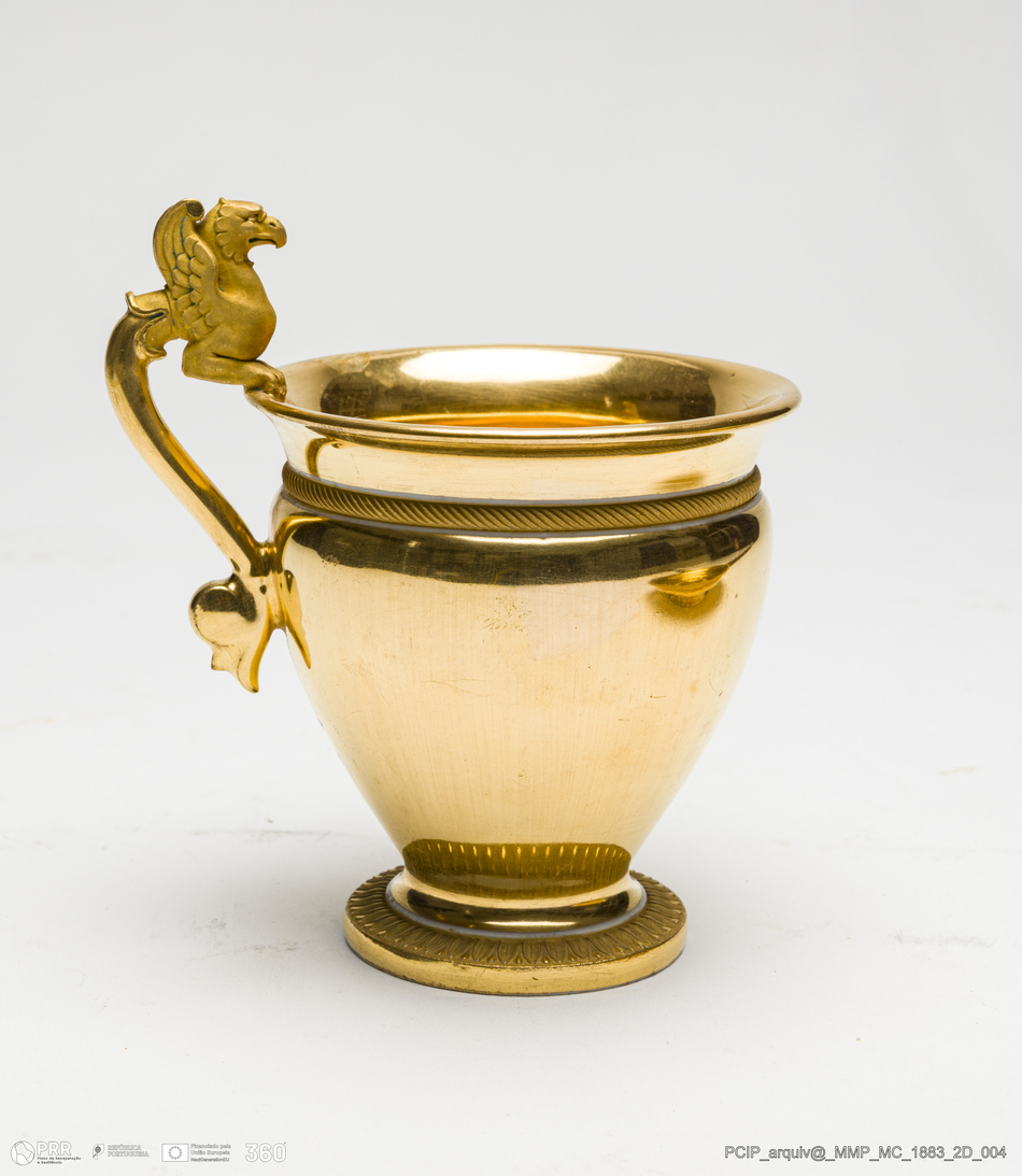 Matéria/Técnica: Porcelana moldada. Vidrado dourado metalizado; Cronologia: 1784-1817; Autoria: Jean Nepomucène Hermann Nast, Paris; Dimensões (cm): Altura: 13; Diâmetro: 15,5.