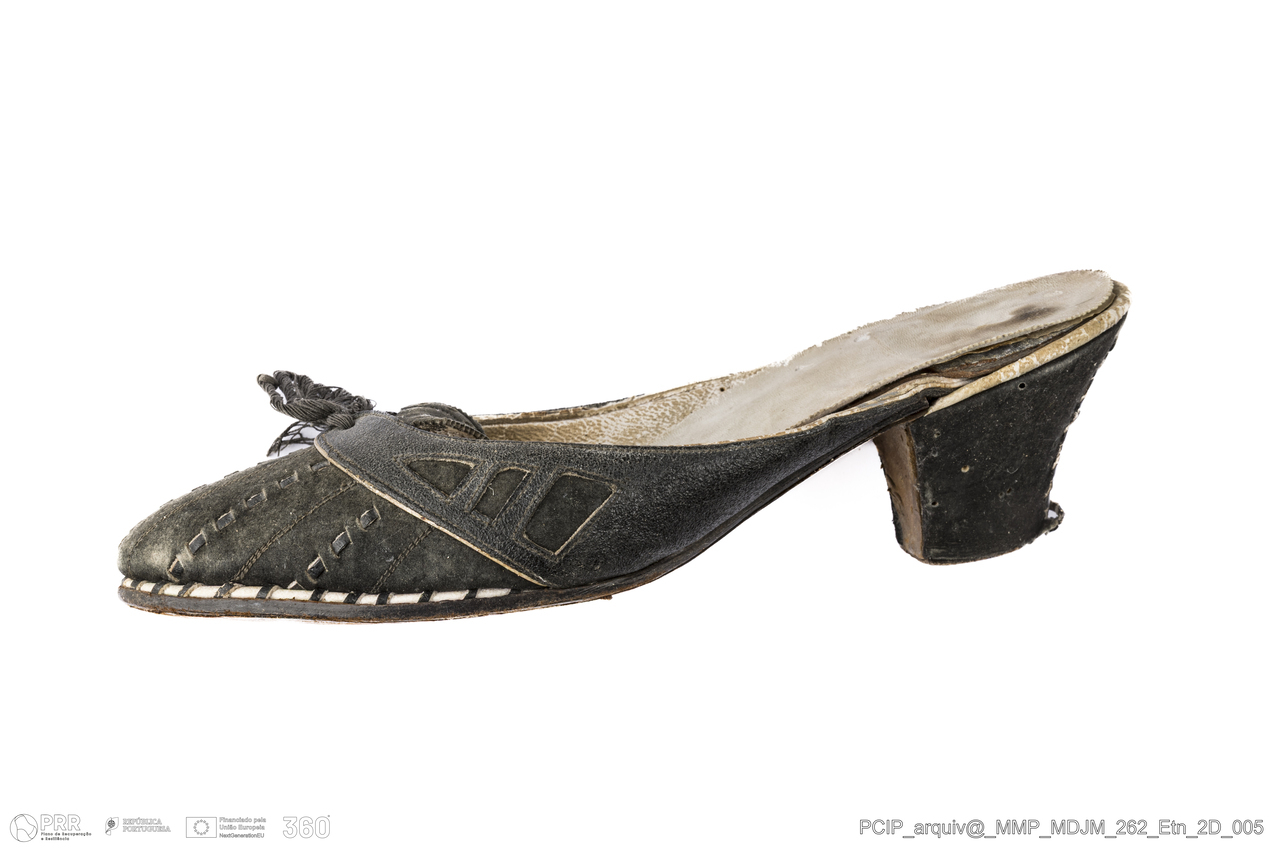 Matéria/Técnica: Cabedal e camurça; Cronologia: Séc. XX; Autoria: Desconhecida; Dimensões: Altura: 32,2 cm x Largura: 23,6 cm.
