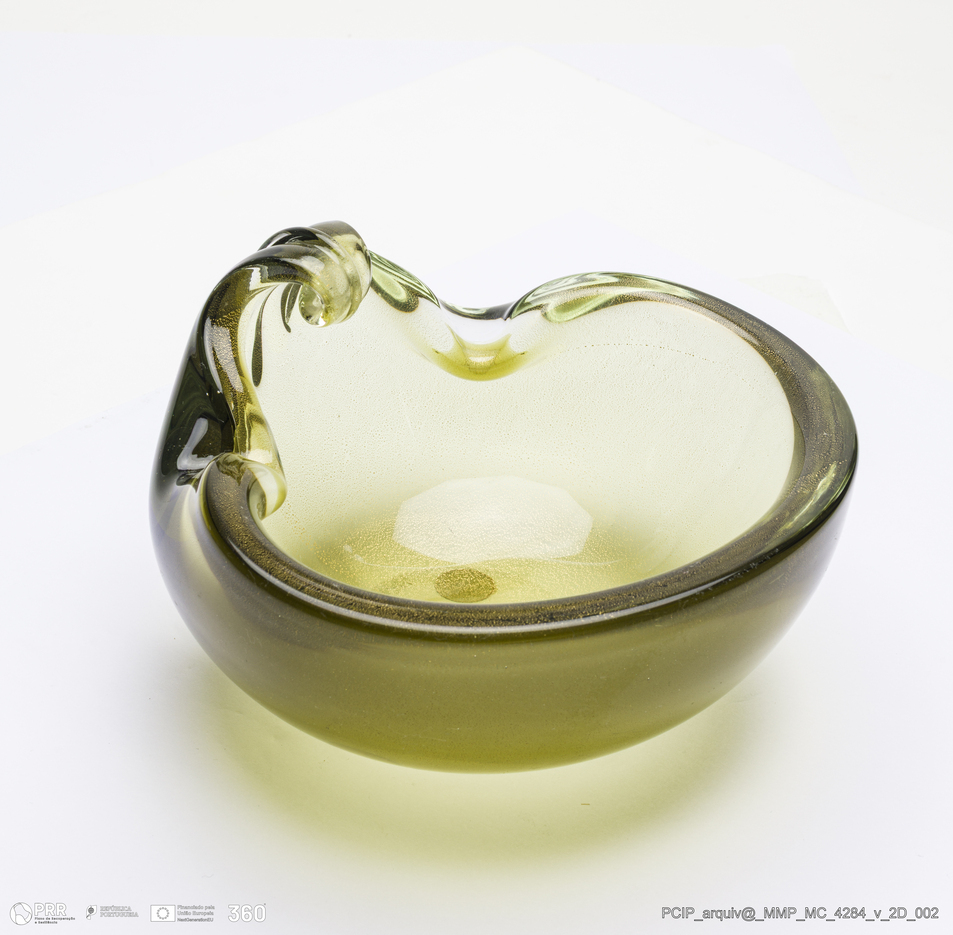 Matéria/Técnica: Vidro e folha de ouro. Vidro transparente com com verde e dourado; Cronologia: Século XX; Autoria: Desconhecido / Murano, Itália; Dimensões (cm): Altura: 10; Largura: 16; Comprimento: 17.