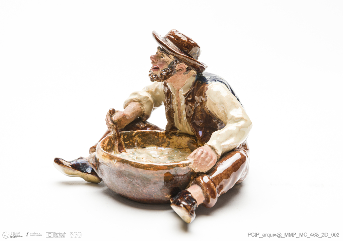 Matéria/Técnica: Barro vermelho moldado, com esmaltes. Vidrado polícromo: castanho, beije e branco. Mãos e rosto não vidrados; Cronologia: 1905; Autoria: Rafael Bordalo Pinheiro, Fábrica de Faianças das Caldas da Rainha; Dimensões (cm): Altura: 8; Largura: 11; Comprimento: 10.