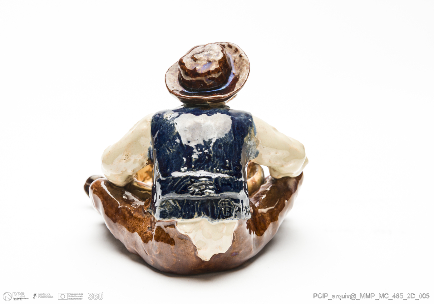 Matéria/Técnica: Barro vermelho moldado, com esmaltes. Vidrado polícromo: castanho, beije e branco. Mãos e rosto não vidrados; Cronologia: 1905; Autoria: Rafael Bordalo Pinheiro, Fábrica de Faianças das Caldas da Rainha; Dimensões (cm): Altura: 8; Largura: 11; Comprimento: 10.