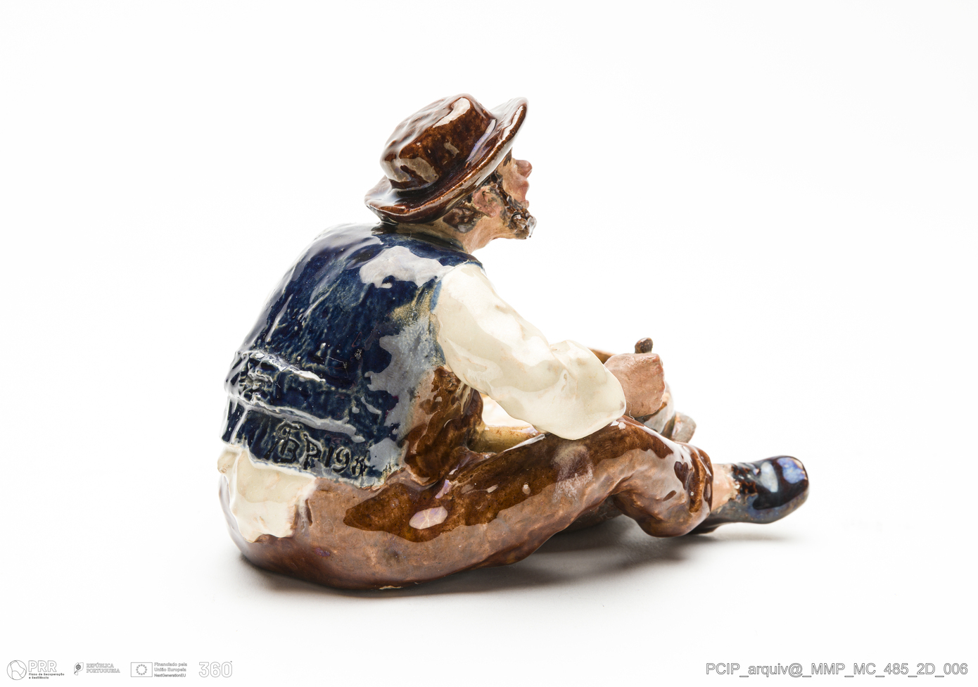 Matéria/Técnica: Barro vermelho moldado, com esmaltes. Vidrado polícromo: castanho, beije e branco. Mãos e rosto não vidrados; Cronologia: 1905; Autoria: Rafael Bordalo Pinheiro, Fábrica de Faianças das Caldas da Rainha; Dimensões (cm): Altura: 8; Largura: 11; Comprimento: 10.