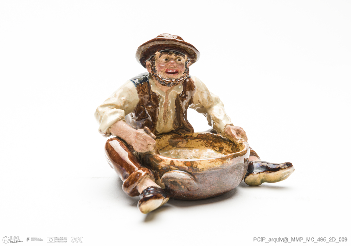 Matéria/Técnica: Barro vermelho moldado, com esmaltes. Vidrado polícromo: castanho, beije e branco. Mãos e rosto não vidrados; Cronologia: 1905; Autoria: Rafael Bordalo Pinheiro, Fábrica de Faianças das Caldas da Rainha; Dimensões (cm): Altura: 8; Largura: 11; Comprimento: 10.