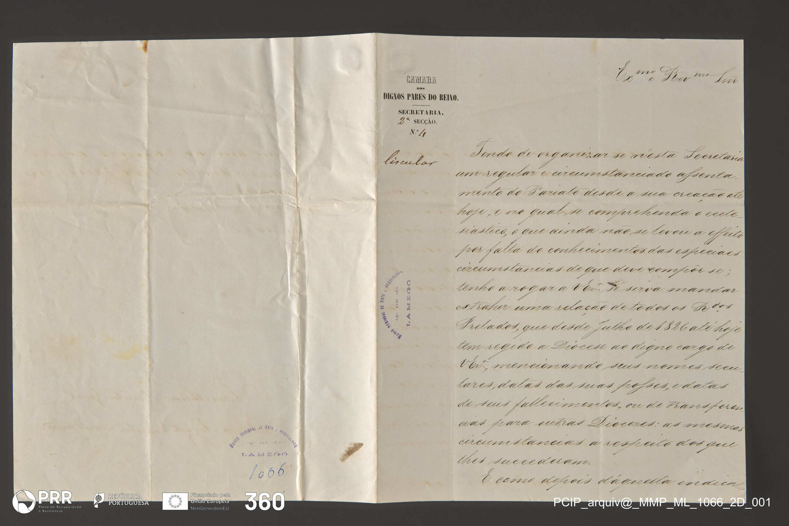 Matéria/Técnica: Escrito à pena com letra caligráfica; Cronologia: 1856; Autoria: Constâncio, Diogo Augusto, ( Conselheiro Director Geral da Câmara dos Dignos Pares do Reino); Dimensões (cm): Altura: 25,5 x Largura: 40,6.