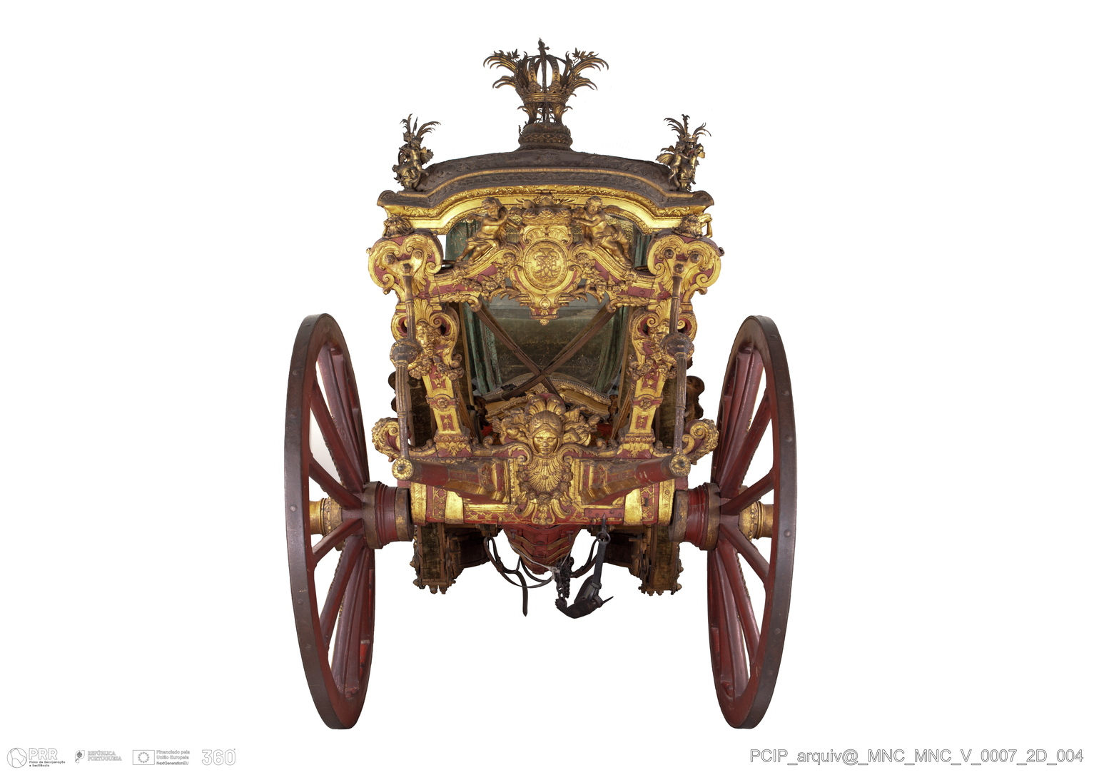 Matéria/ Técnica: Madeiras; couro; bronze; cobre; ferro; vidro; tartaruga; sedas; veludo de seda; Cronologia: 1715; Autoria: Desconhecida; Dimensões (cm): Altura: 373; Largura: 217; Espessura: 6,5 (rodas dianteiras e traseiras); Diâmetro: 88 / 178 (rodas dianteiras e traseiras); Comprimento: 713; Outras dimensões: Caixa: 343 X 265 X 177 .