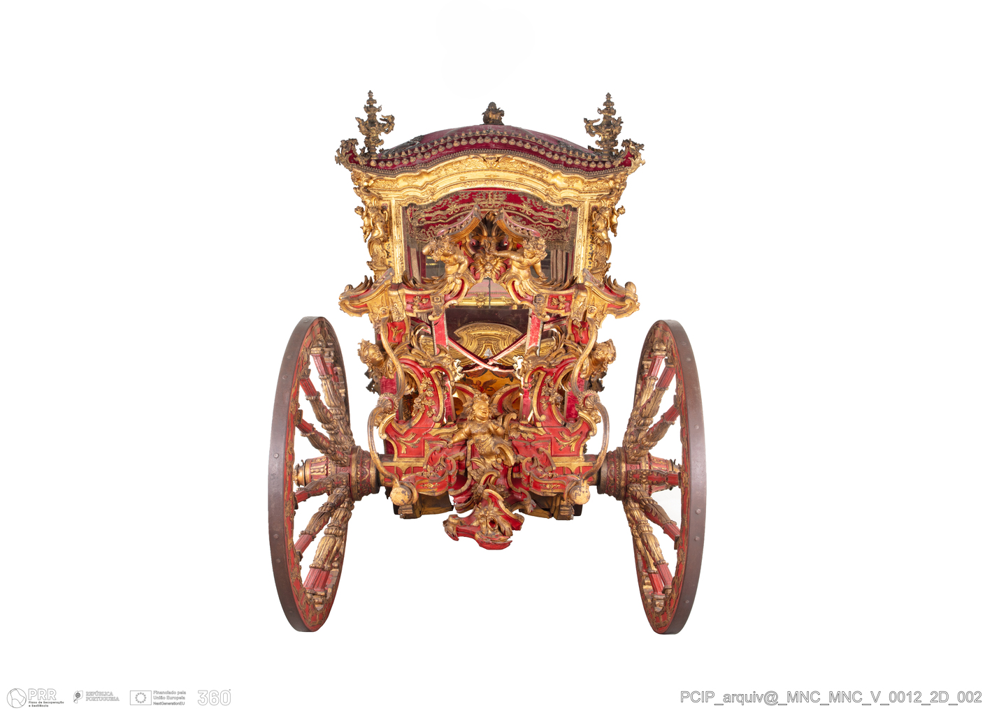 Matéria/ Técnica: Madeira (carvalho e/ou azinho); bronze; vidro; seda; tafetá; veludo; estopa; Cronologia: 1723 - 1729; Autoria: Quillard, Pierre-Antoine (Paris, - 1733) ; José de Almeida; Dimensões (cm): Altura: 342; Largura: 215; Espessura: 7,5 / 7,7 (rodas dianteiras e traseiras); Diâmetro: 83 / 113 (rodas dianteiras e traseiras); Comprimento: 641; Outras dimensões: 307 X 281 X 187 (caixa).