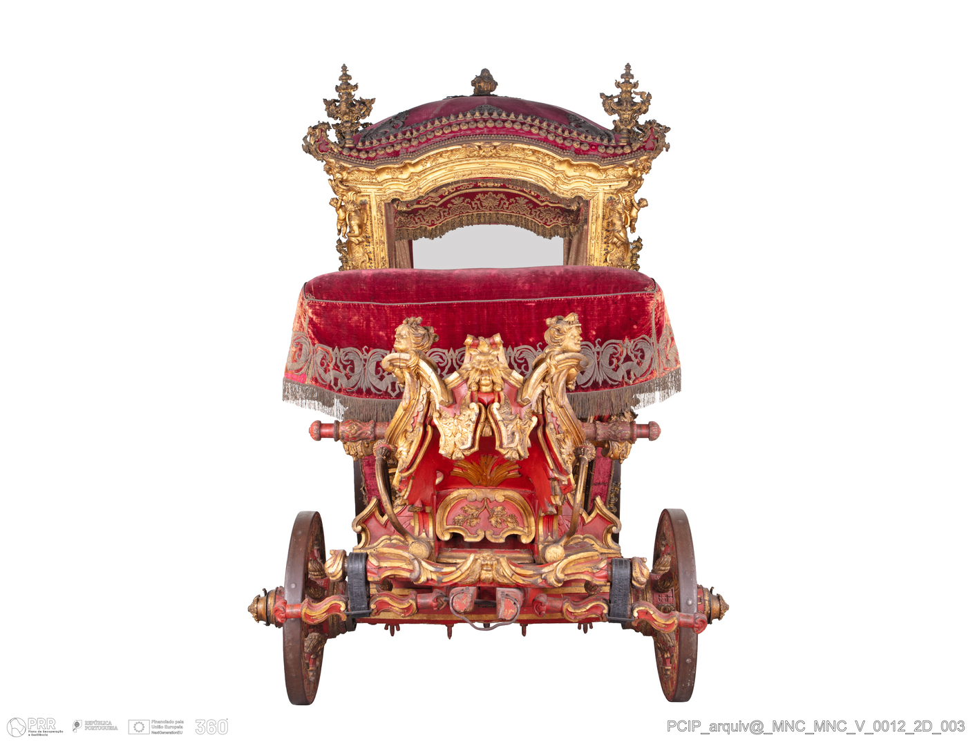 Matéria/ Técnica: Madeira (carvalho e/ou azinho); bronze; vidro; seda; tafetá; veludo; estopa; Cronologia: 1723 - 1729; Autoria: Quillard, Pierre-Antoine (Paris, - 1733) ; José de Almeida; Dimensões (cm): Altura: 342; Largura: 215; Espessura: 7,5 / 7,7 (rodas dianteiras e traseiras); Diâmetro: 83 / 113 (rodas dianteiras e traseiras); Comprimento: 641; Outras dimensões: 307 X 281 X 187 (caixa).