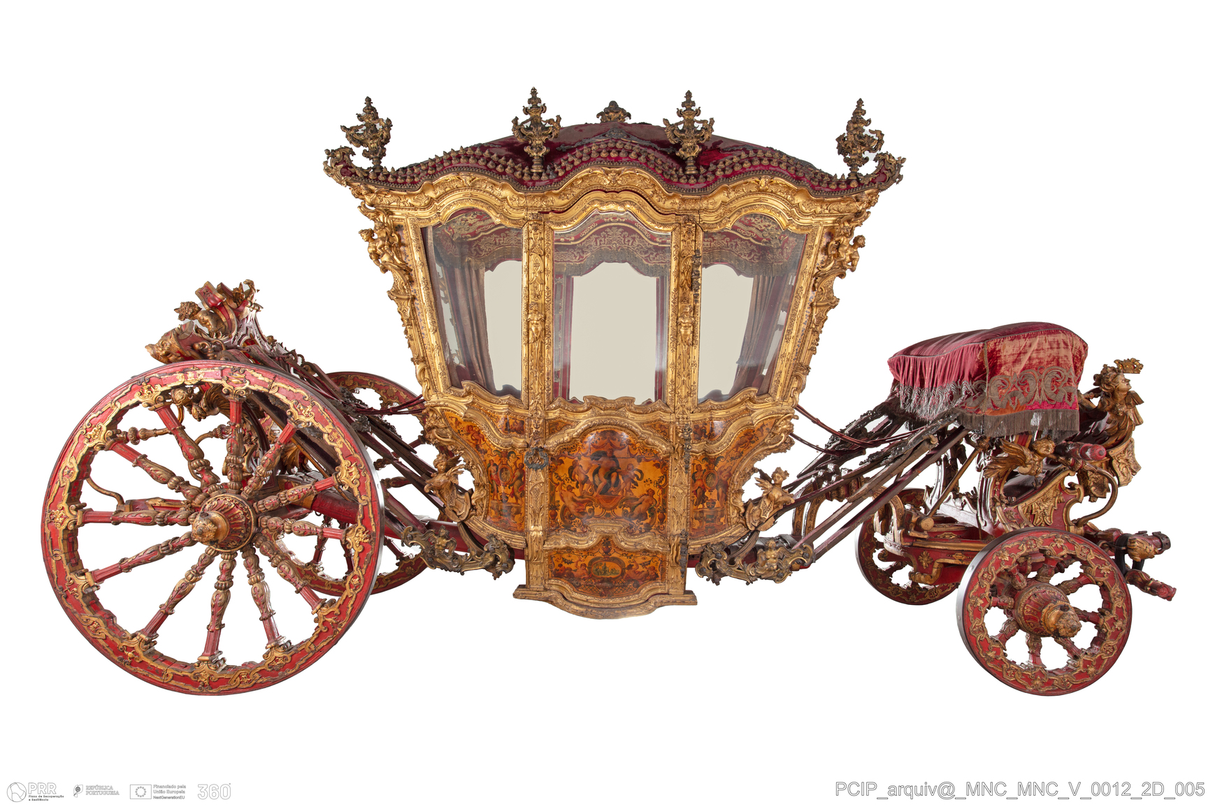 Matéria/ Técnica: Madeira (carvalho e/ou azinho); bronze; vidro; seda; tafetá; veludo; estopa; Cronologia: 1723 - 1729; Autoria: Quillard, Pierre-Antoine (Paris, - 1733) ; José de Almeida; Dimensões (cm): Altura: 342; Largura: 215; Espessura: 7,5 / 7,7 (rodas dianteiras e traseiras); Diâmetro: 83 / 113 (rodas dianteiras e traseiras); Comprimento: 641; Outras dimensões: 307 X 281 X 187 (caixa).