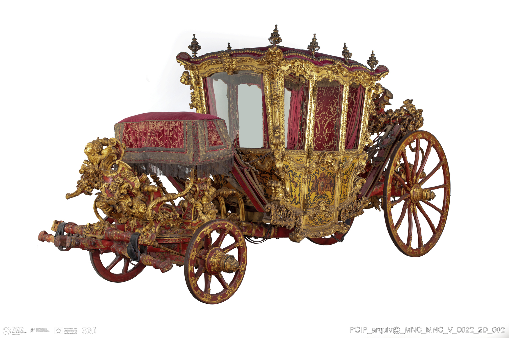 Matéria/ Técnica: Madeira (carvalho e/ou azinho); bronze; couro; vidro; veludo de seda; tafetá de seda; Cronologia: 1750 - 1775; Autoria: Machado, Cirilo Volkmar (Lisboa, 1748 - 1823); Dimensões (cm): Altura: 298; Largura: 225; Espessura: 5 / 5,7 (rodas dianteiras e traseiras); Diâmetro: 83 / 189 (rodas dianteiras e traseiras); Comprimento: 642; Outras dimensões: 250 X 248 X 165 (caixa).