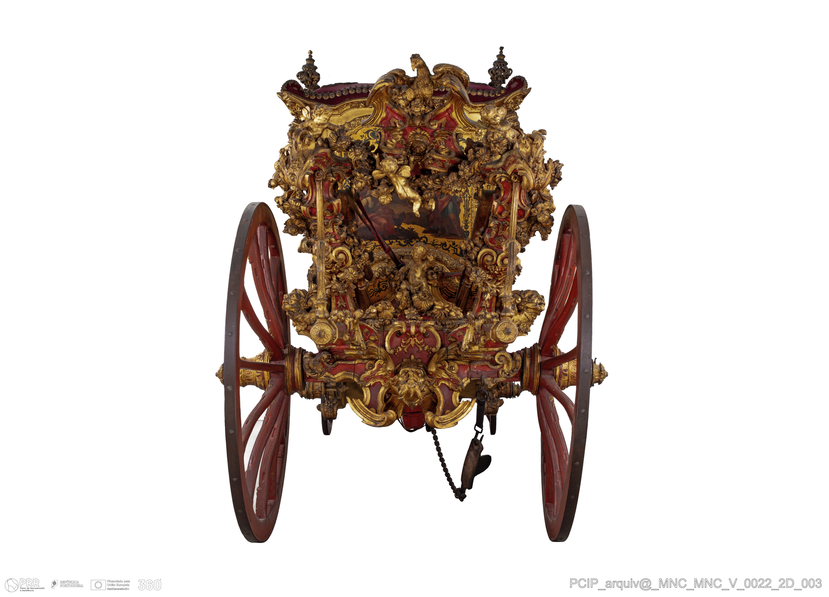 Matéria/ Técnica: Madeira (carvalho e/ou azinho); bronze; couro; vidro; veludo de seda; tafetá de seda; Cronologia: 1750 - 1775; Autoria: Machado, Cirilo Volkmar (Lisboa, 1748 - 1823); Dimensões (cm): Altura: 298; Largura: 225; Espessura: 5 / 5,7 (rodas dianteiras e traseiras); Diâmetro: 83 / 189 (rodas dianteiras e traseiras); Comprimento: 642; Outras dimensões: 250 X 248 X 165 (caixa).