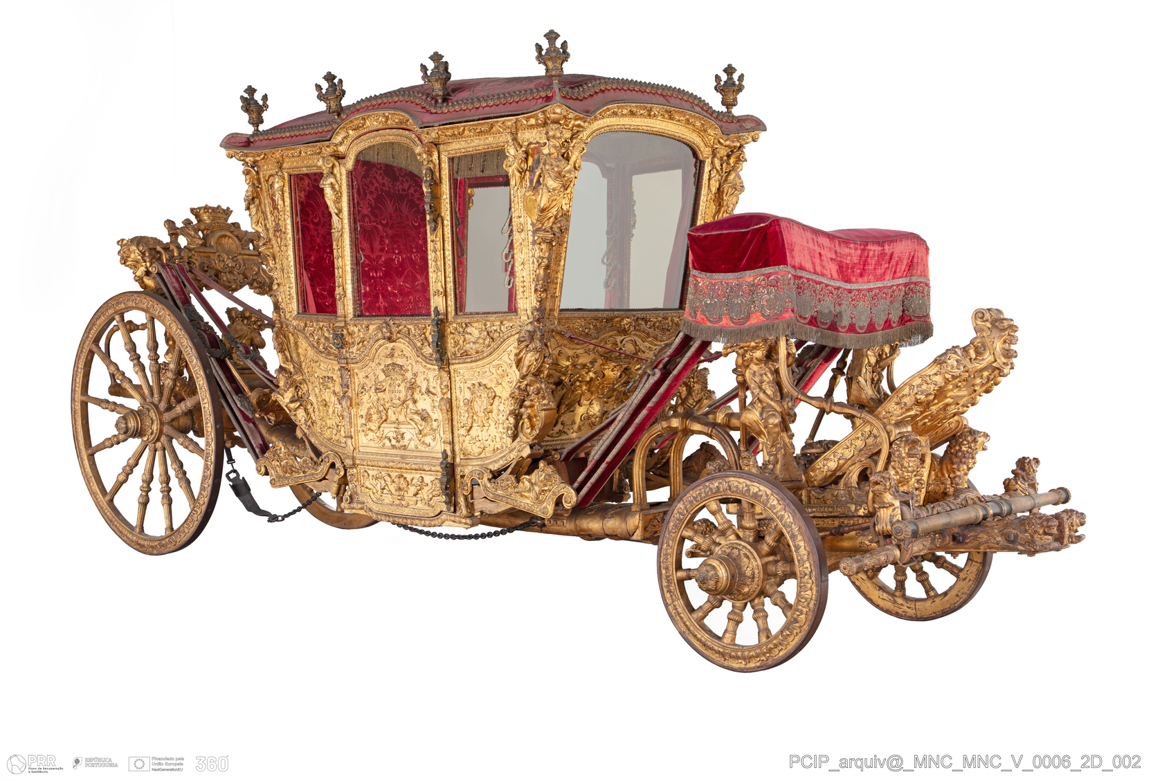 Matéria/ Técnica: Madeiras (azinho, sobro e/ou carvalho); cristal; bronze; ferro; veludo; tafetá de seda; Cronologia: 1701 - 1708; Autoria: Desconhecida; Dimensões (cm): Altura: 292; Largura: 209; Espessura: 6,5 (rodas dianteiras e traseiras); Diâmetro: 87 / 172 (rodas dianteiras e traseiras); Comprimento: 684; Outras dimensões: 274 X 251 X 172 (caixa).