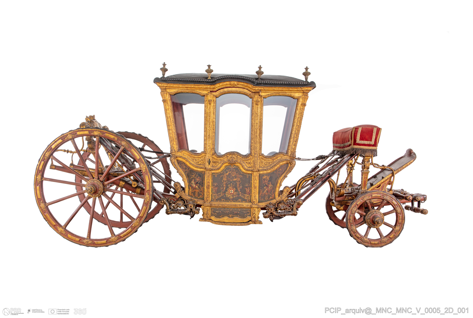 Matéria/ Técnica: Madeira (azinho e/ou carvalho); bronze; ferro; couro; vidro; veludo de seda; estopa de linho; Cronologia: 1660 - 1668; Autoria: Desconhecida; Dimensões (cm): Altura: 260; Largura: 189; Espessura: 6 / 6,5 (rodas dianteiras e traseiras); Diâmetro: 83 / 174 (rodas dianteiras e traseiras); Comprimento: 558; Outras dimensões: 230 X 231 X 146 (caixa).