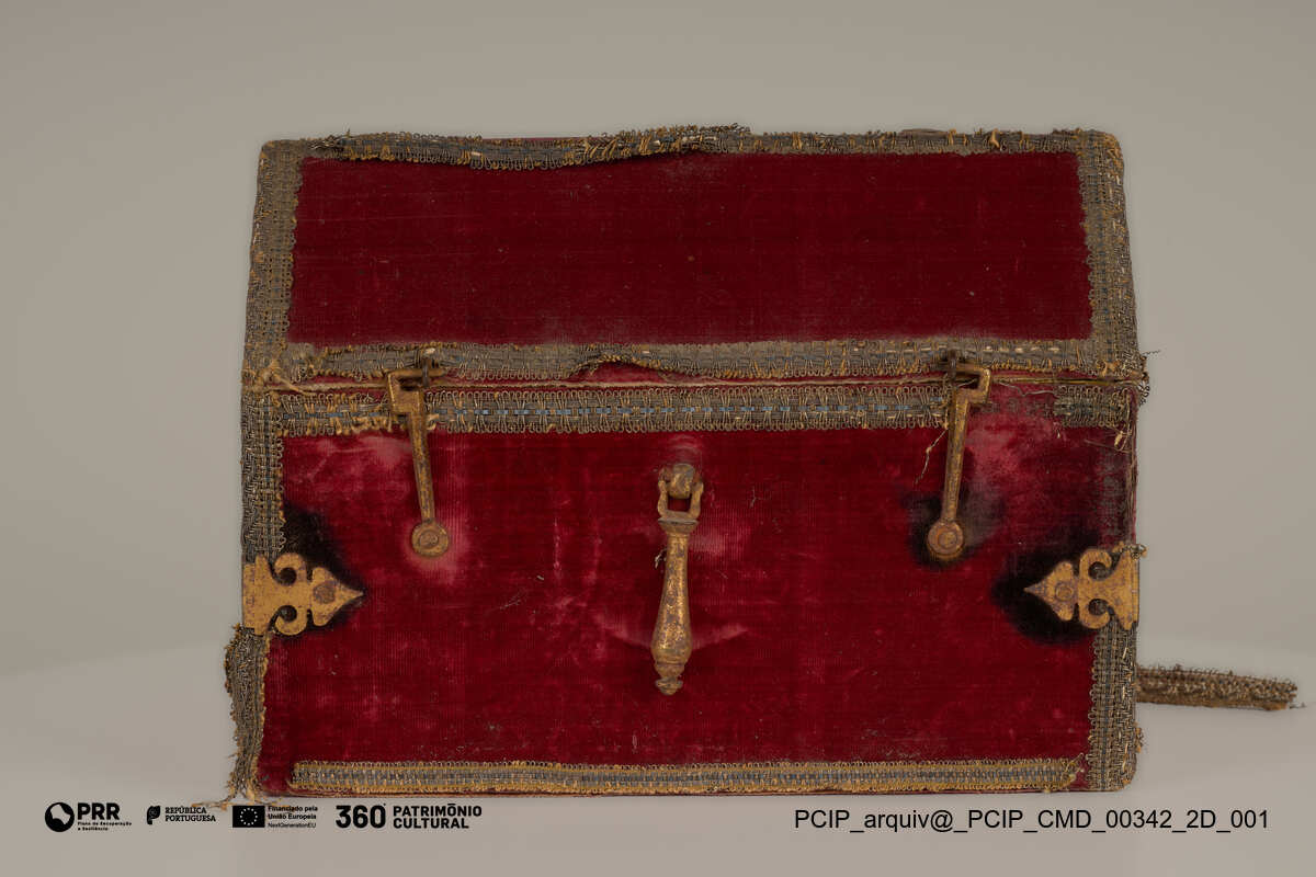 Matéria/Técnica: Madeira, ferro, veludo de seda, damasco de seda.; Cronologia: XVII; Autoria: Desconhecida; Dimensões: Altura: 18,5 cm; Largura: 25 cm; Profundidade: 17 cm.