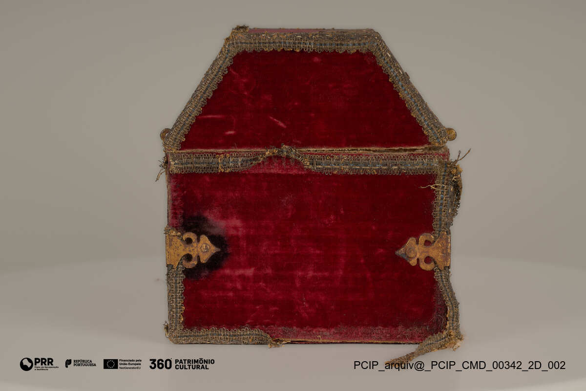 Matéria/Técnica: Madeira, ferro, veludo de seda, damasco de seda.; Cronologia: XVII; Autoria: Desconhecida; Dimensões: Altura: 18,5 cm; Largura: 25 cm; Profundidade: 17 cm.