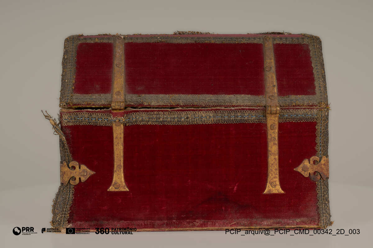 Matéria/Técnica: Madeira, ferro, veludo de seda, damasco de seda.; Cronologia: XVII; Autoria: Desconhecida; Dimensões: Altura: 18,5 cm; Largura: 25 cm; Profundidade: 17 cm.