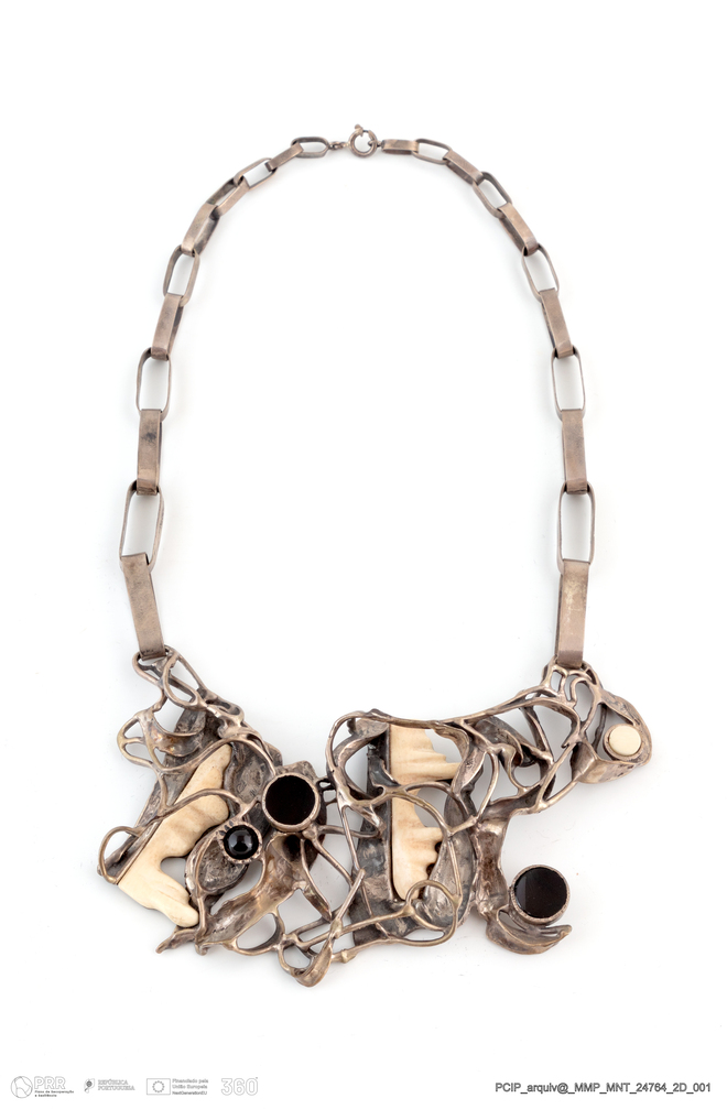 Matéria/Técnica: Prata; marfim; ónix.; Cronologia: 1989; Autoria: Gordilho, Alberto; Dimensões (cm): Altura: 6,5 cm; Comprimento: 46 cm.
