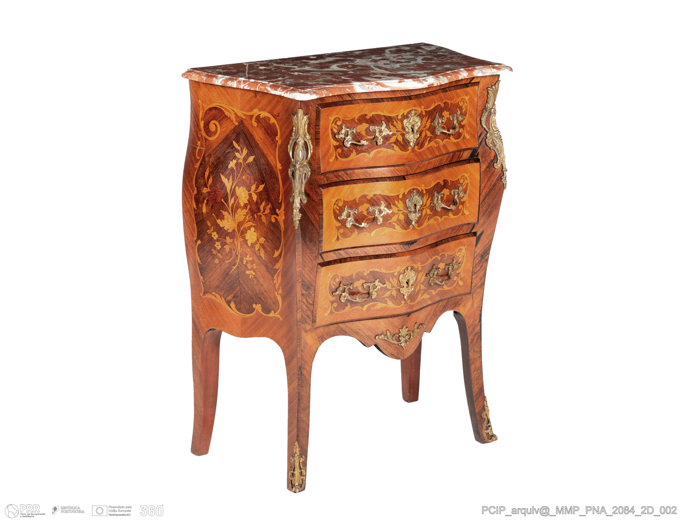 Matéria/Técnica: madeira de pau-rosa, pau-santo, pau-cetim e outras; bronze; pedra mármore; Cronologia: Século XIX; Autoria: Desconhecida; Dimensões (cm): Altura: 90; Largura: 70; Profundidade: 40.