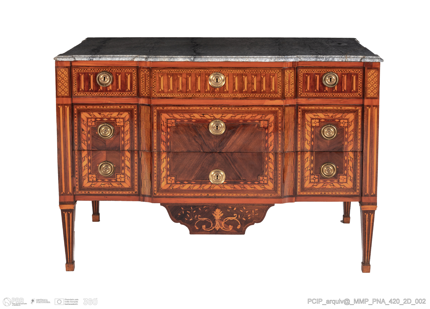 Matéria/Técnica: Madeiras exóticas - pau-cetim, pau rosa, pau-santo -, mogno, pinho, casquinha, espinheiro; liga de cobre (latão); mármore rosa; Cronologia: 1775 - 1800; Autoria: Desconhecida; Dimensões (cm): Altura: 89; Largura: 125; Profundidade: 62,4.