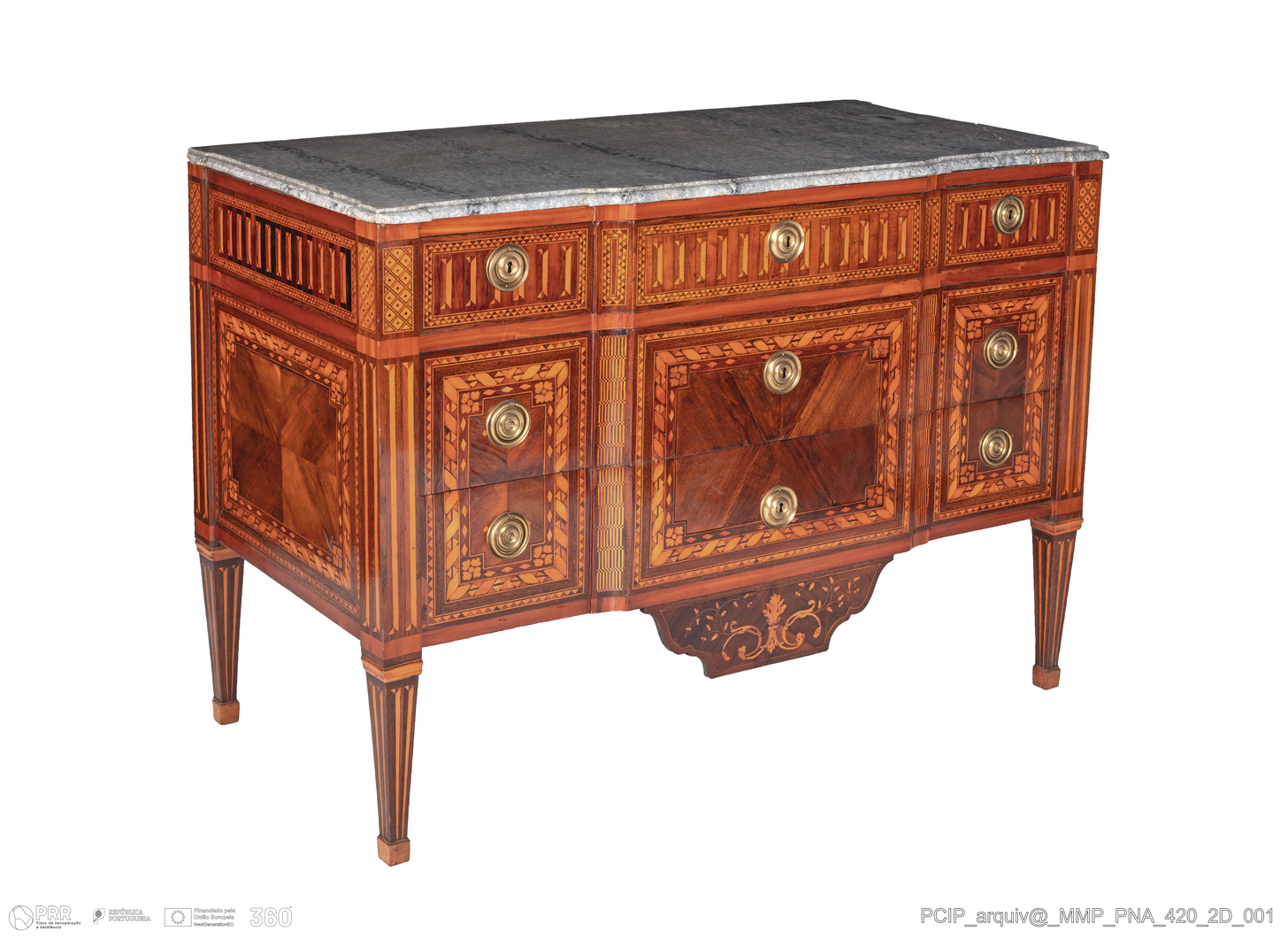 Matéria/Técnica: Madeiras exóticas - pau-cetim, pau rosa, pau-santo -, mogno, pinho, casquinha, espinheiro; liga de cobre (latão); mármore rosa; Cronologia: 1775 - 1800; Autoria: Desconhecida; Dimensões (cm): Altura: 89; Largura: 125; Profundidade: 62,4.