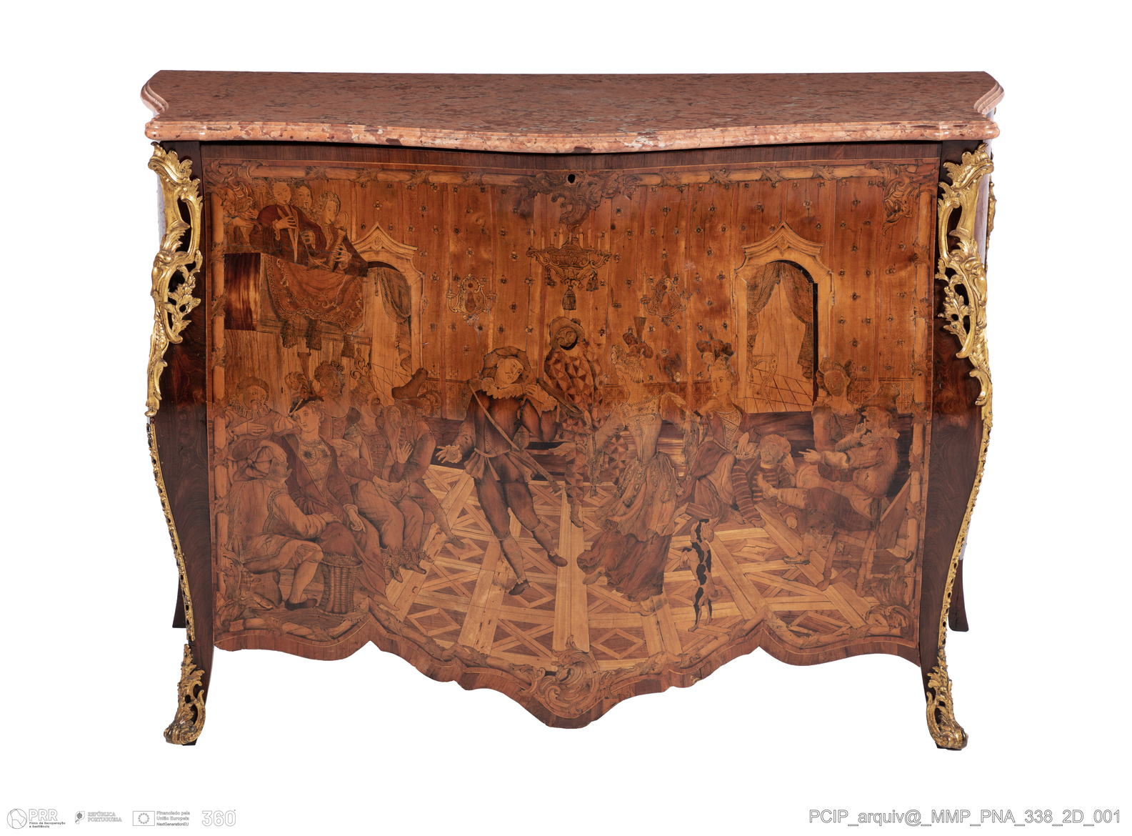 Matéria/Técnica: Madeiras de casquinha, pinho, mogno, pau-santo, pau rosa, pau cetim, pau violeta (?), buxo, espinheiro, sicomóro e cerejeira (?); madeira tingida; bronze dourado; mármore rosado; Cronologia: Século XIX; Autoria: Desconhecida; Dimensões (cm): Altura: 85,3; Largura: 125,0; Profundidade: 62,5.