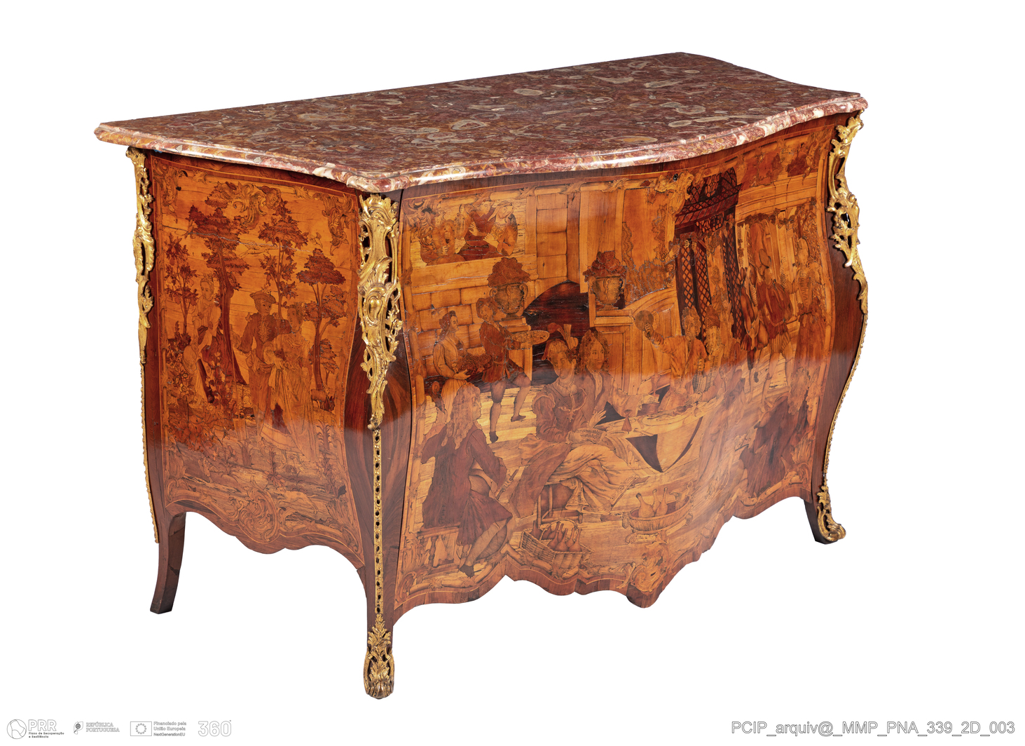 Matéria/Técnica: Madeiras de casquinha, pinho, mogno, pau-santo, pau rosa, pau cetim, pau violeta (?), buxo, espinheiro, sicomóro e cerejeira (?); madeira tingida; bronze dourado; mármore cor de vinho; Cronologia: Século XIX; Autoria: Desconhecida; Dimensões (cm): Altura: 84,7; Largura: 133,0; Profundidade: 67,8.